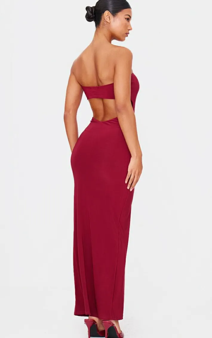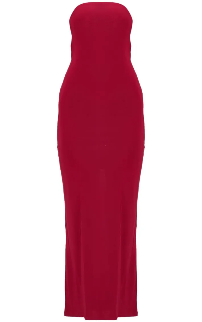 Show off your shape in this burgundy double layer slinky bandeau low back maxi dress. Brought to you in a burgundy double layer slinky material with a bandeau fit and a low back design, this maxi dress is the ultimate must have to have you standing out from the rest. Style with a pair of heels and accessories of your choice for a look like no other.