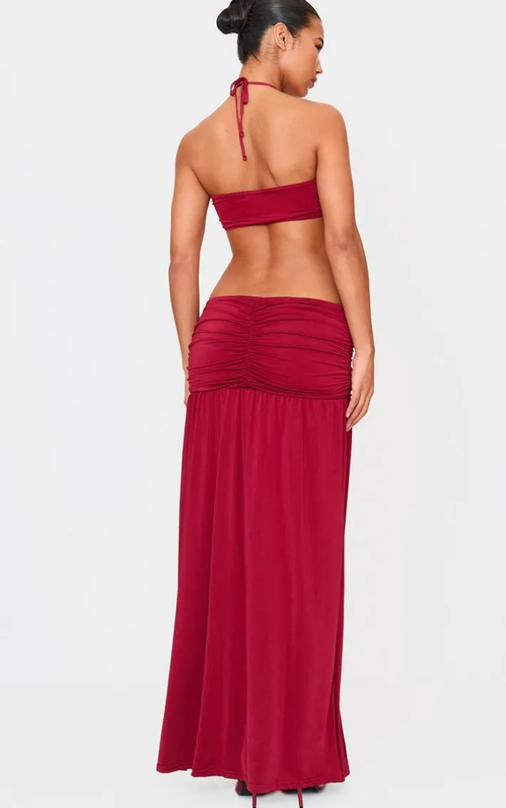 The new you starts here with this burgundy double layer slinky tie neck cut out maxi dress. Brought to you in a burgundy hue double layer slinky material with a tie neck design and cut out detail, this maxi dress is all the new you need. Style with high heels and gold accessories for a look like no other.