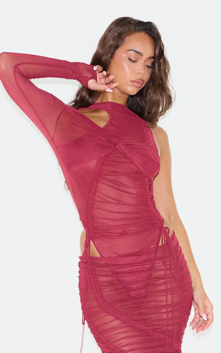 When your weekend look needs a little more drama, we’ve got you covered with this dark red extreme ruched seam detail one sleeve bodysuit. Made from a dark red material with an extreme ruched design, seam detailing and one sleeve, how can you resist? Pair this dark red bodysuit with the matching skirt, heels and gold accessories for a look that will steal all the stares.