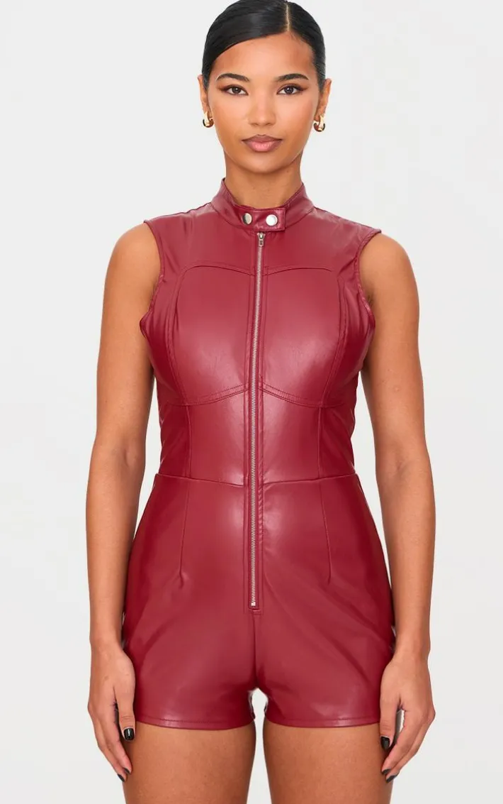 This burgundy faux leather zip up sleeveless romper is here to solve all of your ‘what to wear’ dilemmas this weekend. Made from a burgundy faux leather material with a sleeveless design and a zip up fastening, what’s not to love? Style this faux leather romper with knee length heeled boots and gold accessories for a look that will turn heads.