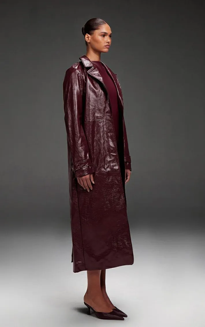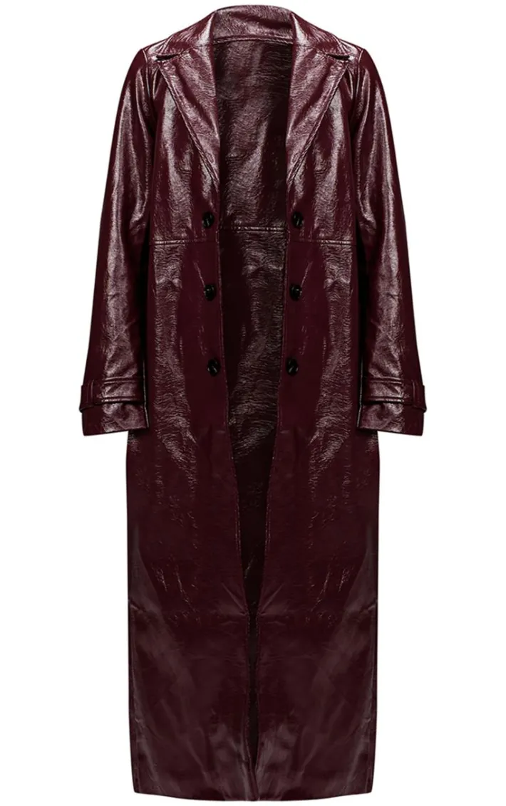 This burgundy high shine textured faux leather maxi coat is at the top of our new season hit list. Brought to you in a burgundy hue high shine textured faux leather material with a button through design and a maxi length, what more could you need? Layer this faux leather coat over a neutral mini skirt and loafers for a look that is sure to earn you some serious style points.