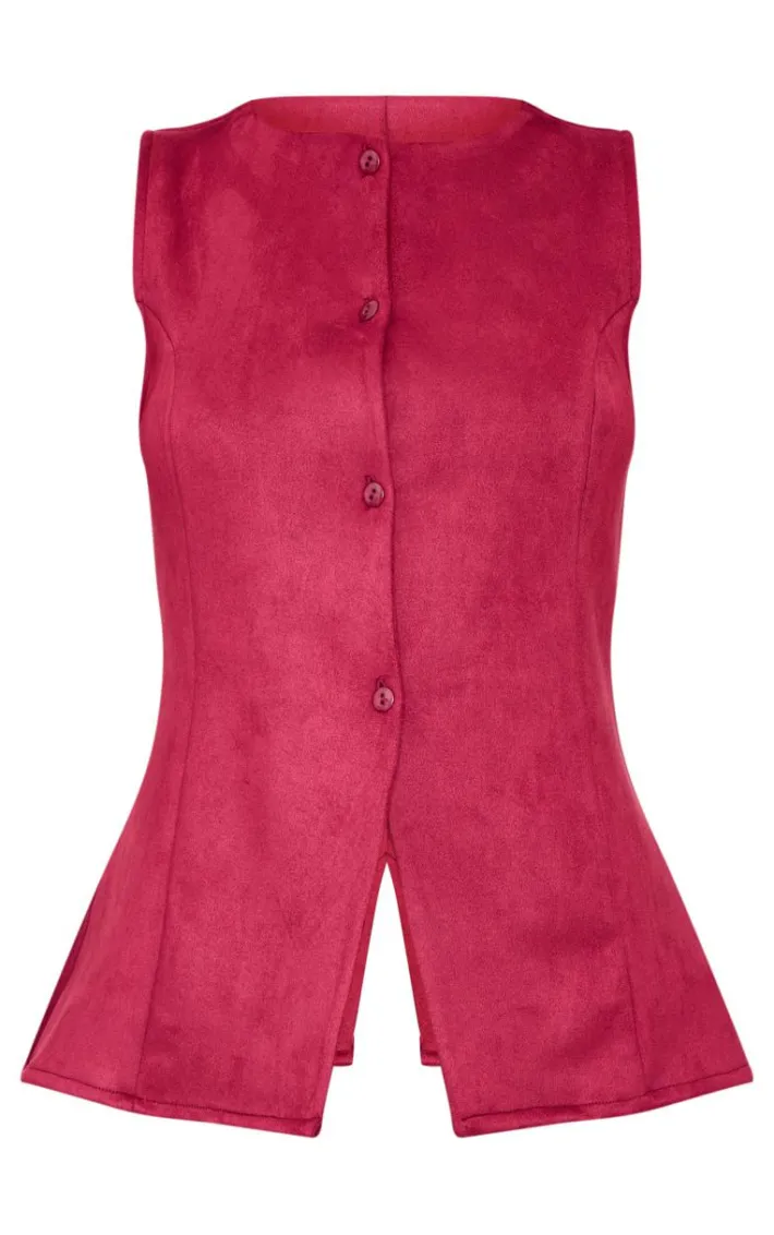 Take a chance o this burgundy longline faux suede vest for a look you won’t regret. Brought to you in a seasonal burgundy tone, with a luxe faux suede material and flattering longline finish, this vest is sure to be your next go-to. team with a mini skirt, pair of heels and simple accessories for a fool proof finish.
