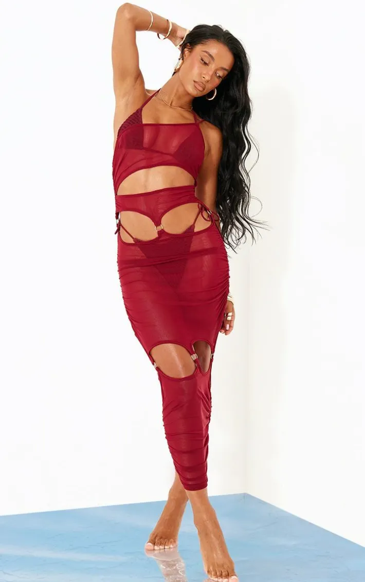 Enter your next vacay in style with this burgundy mesh cut out O ring midaxi beach dress. Brought to you in a burgundy mesh material with a cut out design, O ring detailing and a flattering midaxi fit, we are obsessed. Style this beach dress over your fave bikini and just add gold accessories for a look that is sure to steal all the stares.