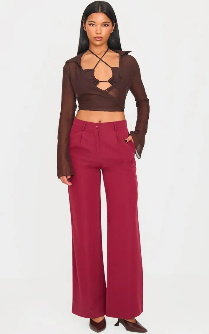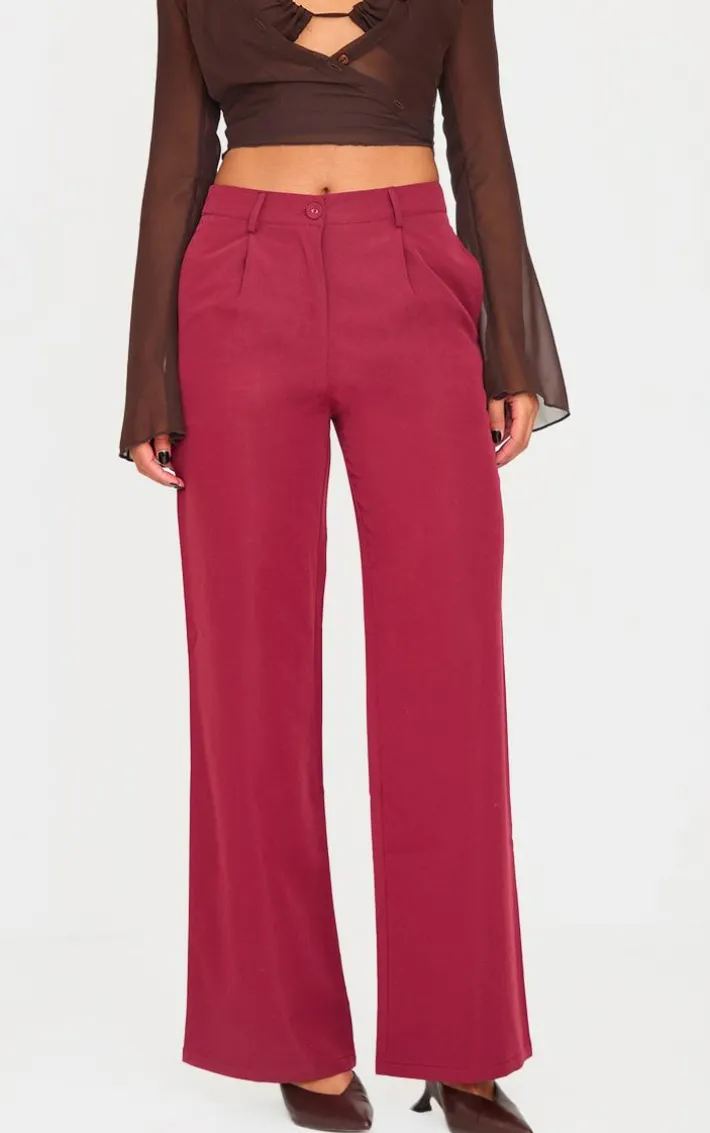 Be on trend with these burgundy peach skin straight leg pants. Brought to you in a burgundy peach skin material with a straight leg fit, you are sure to make a statement. These pants are the perfect addition to your weekend wardrobe. Style with heels and a cropped tee to elevate the look we are obsessing over.