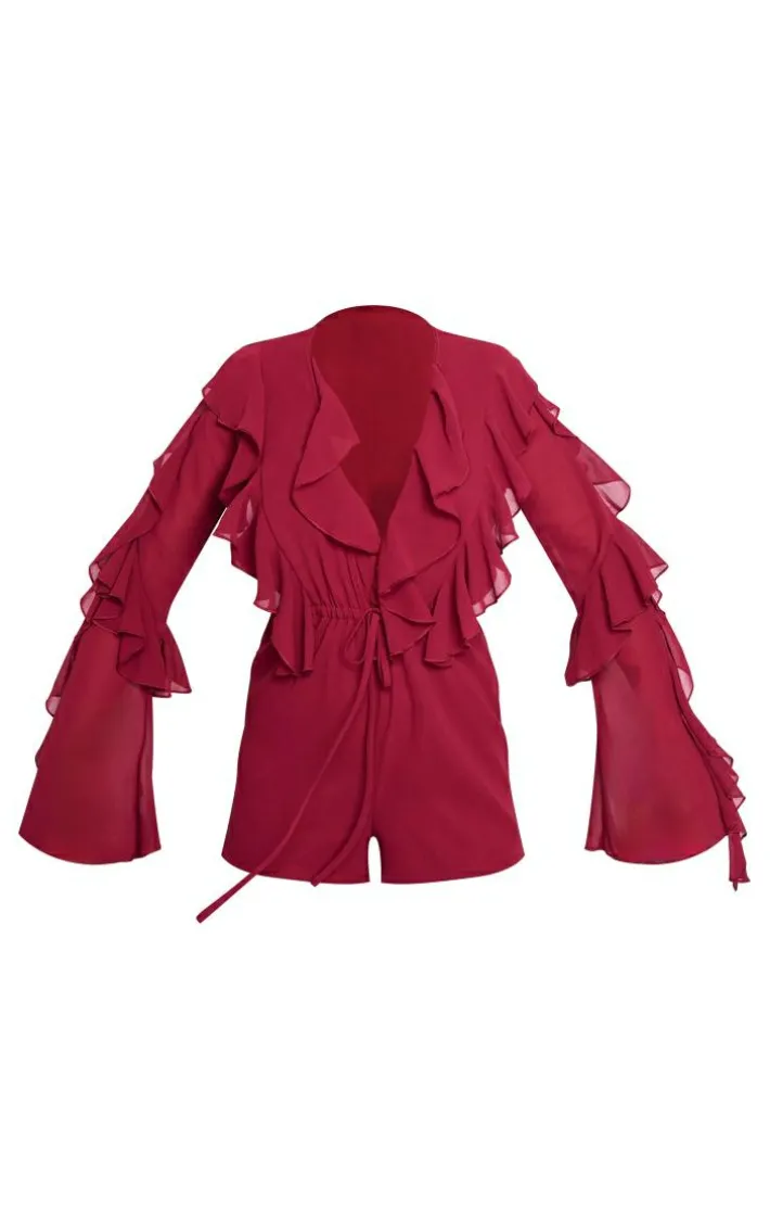 Switch up your weekend style game with this oxblood ruffle detail long sleeve plunge romper. Brought to you in a oxblood hue material with a plunging neckline, long sleeves and ruffle detailing for that extra touch of glam, how can you not fall in love? Style this long sleeve romper with statement heels boots and gold accessories for a look that is sure to gain you all the compliments.