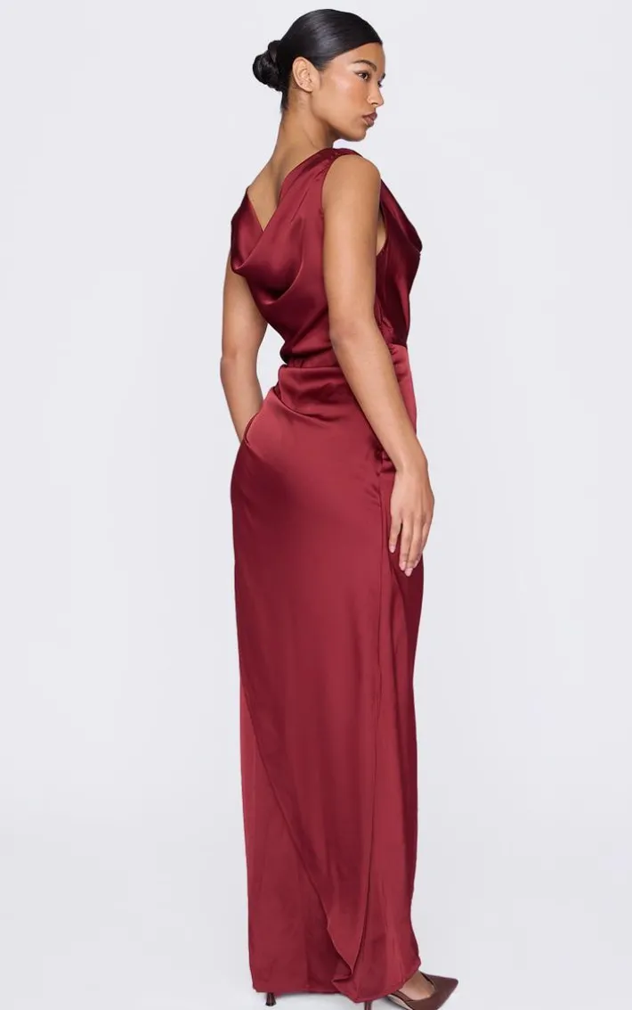 Get heads turning for all the right reasons in this dress. Featuring a burgundy hue satin material with cowl neck and draped detailing, we’re in love. Wear with hoop earrings and heels to elevate the look even further.