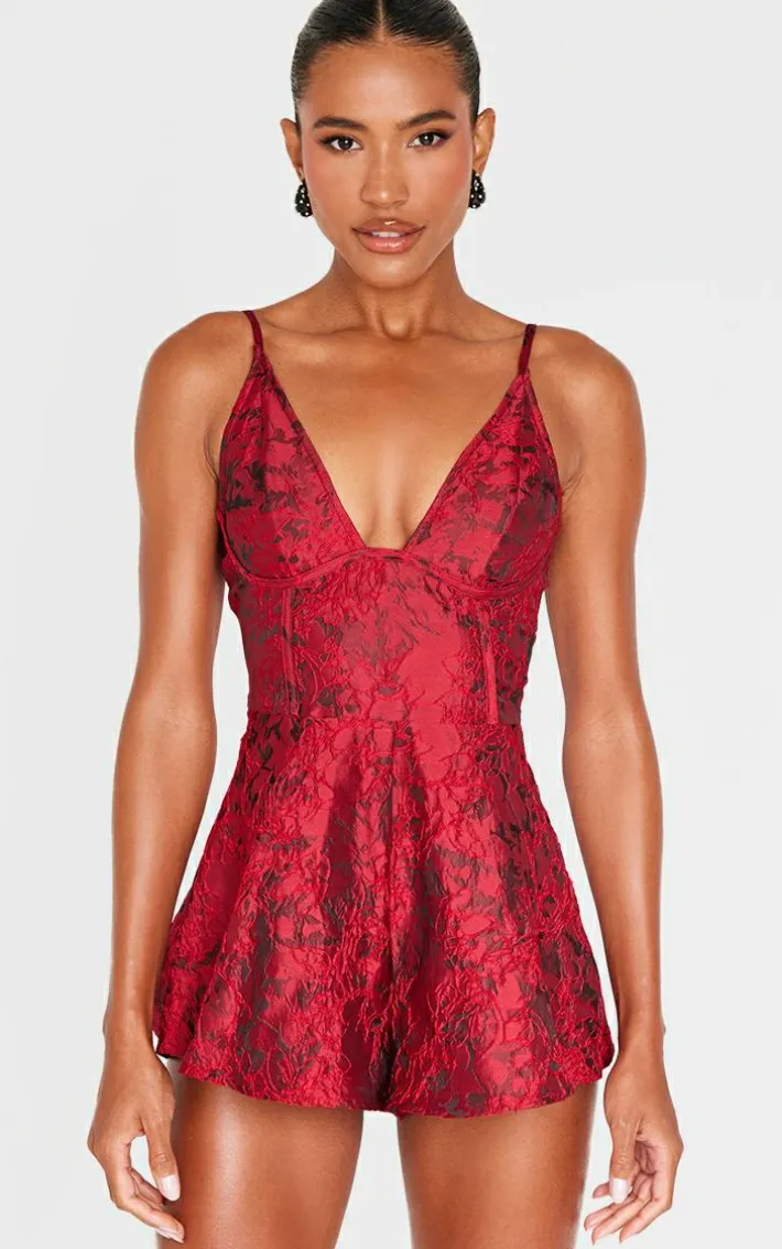Swap your go-to little black dress for this burgundy satin jacquard corset detail floaty romper. Brought to you in a statement burgundy shade, with a luxe satin material, jacquard design and flattering corset detail, this romper deserves to be in your bag. Team with a pair of black earrings and heels to complete the look.