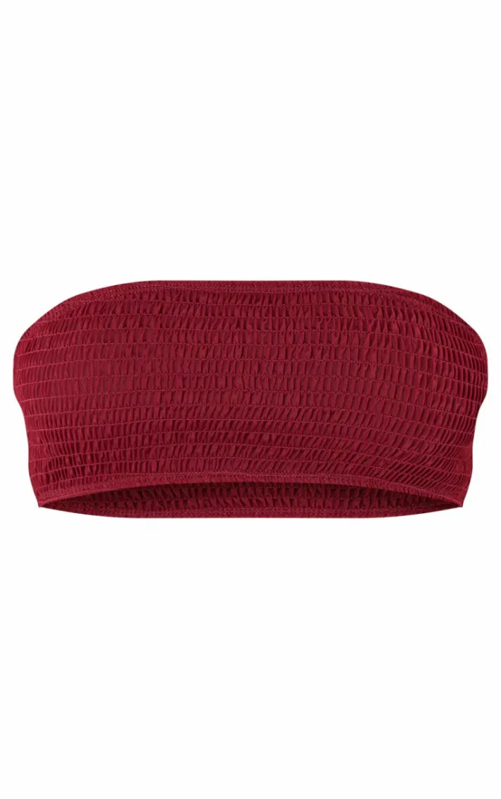Keep those tan lines at bay with this burgundy shirred bandeau bikini top. Brought to you in a burgundy shirred material with a bandeau neckline, this bikini top is a must have. Style with the matching bottoms, beachy sandals and gold accessories for a vacay vibe we can’t get enough of.