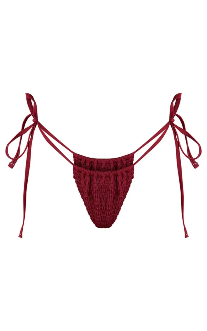 Stay cheeky this summer with these burgundy shirred tie side bikini bottoms. Brought to you in a burgundy shirred material with a tie side fastening, these bikini bottoms are at the top of our wish list. Pair with the matching bikini top for a beachy look we can’t get enough of. It’s official, we’re in love.