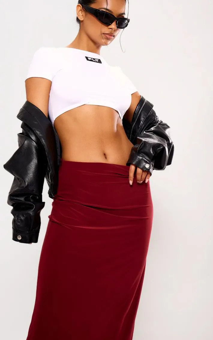 We are obsessing over this hue for your new season wardrobe so get ready to earn some serious style points in this burgundy soft touch low rise drapy maxi skirt. Brought to you in a burgundy soft touch material with a low rise design and a drapy maxi fit, how can you not fall in love? Style this maxi skirt with a crop top, chunky boots and a faux leather jacket for an everyday look that won’t go unnoticed.
