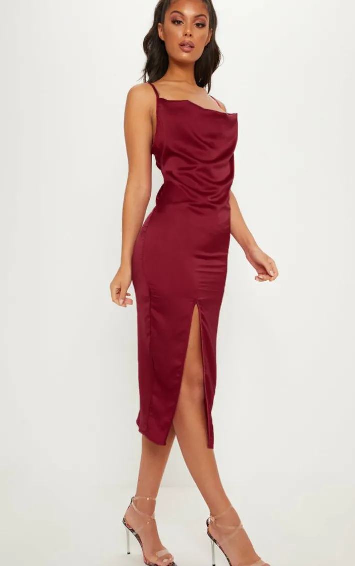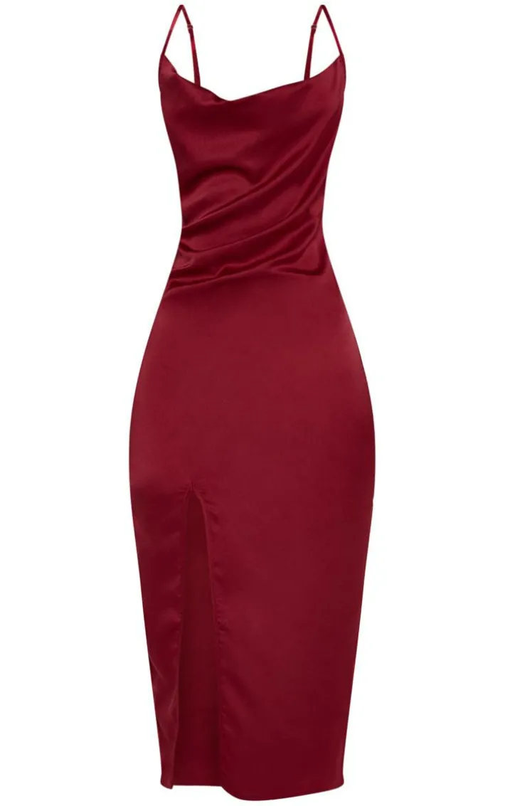 Get weekend ready in this must-have burgundy midi dress. Featuring a burgundy hue satin material with a cowl neckline and a midi length, we are obsessed with this dress style. A silky satin dress like this one is giving us all the luxe vibes for any special event or occasion you’ve got planned. Just pair it with some barely-there heels, a clutch and accessories for a chic look that will really make a statement.