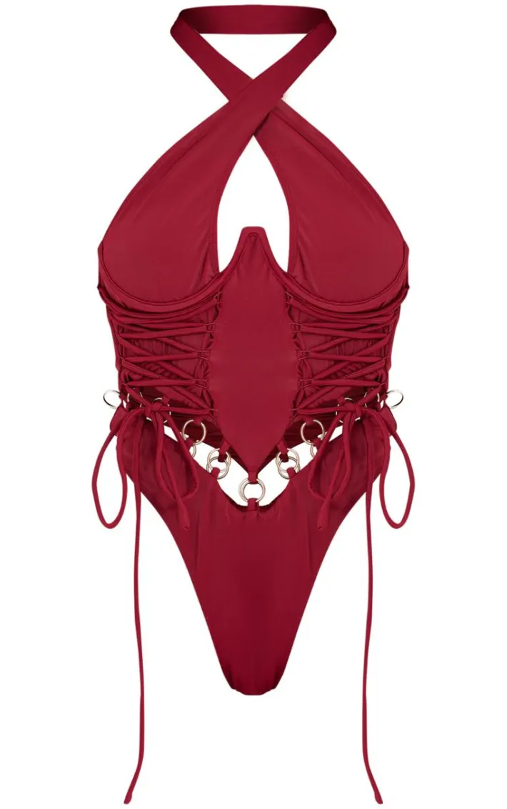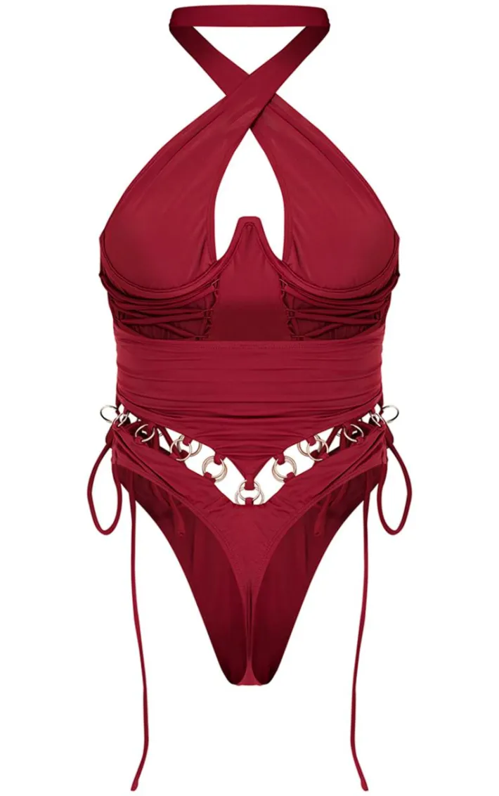 Take your vacay look to new heights with this burgundy underwired lace up O ring high leg swimsuit. Brought to you in a burgundy material with a lace up design, O ring detailing and a flattering underwired fit, how can you say no? Style this burgundy swimsuit with statement accessories for a poolside look that is guaranteed to have all eyes on you.