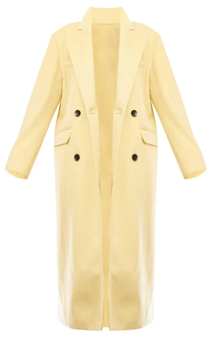 Channel the look everyone is talking about with this butter yellow shoulder padded double breasted brushed faux wool coat. Brought to you in a butter yellow faux wool material with a double breasted design, shoulder pads and a button fastening, how can you say no? Layer this camel coat over your outfit of the day for an effortlessly chic finishing touch to your look.