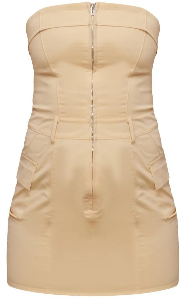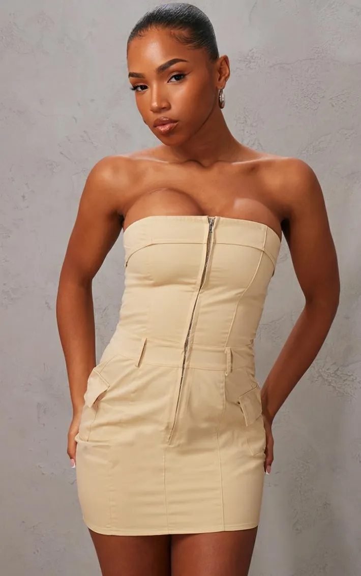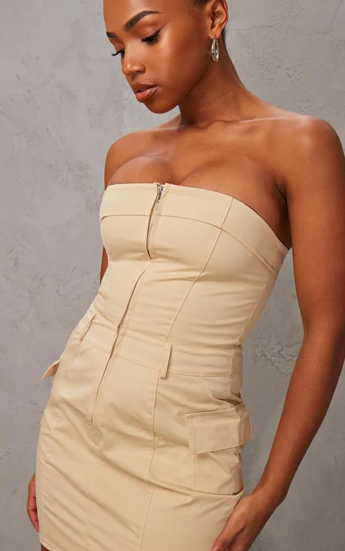 Your new season wardrobe wouldn’t be complete without this camel cargo pocket zip up bandeau bodycon dress, it’s a definite yes from us. Made with a camel hue material, a zip up design and a bandeau style, get ready to add this dreamy piece straight to your basket. Team this bodycon dress with platform sandals and statement sunglasses for a cool, off-duty vibe.