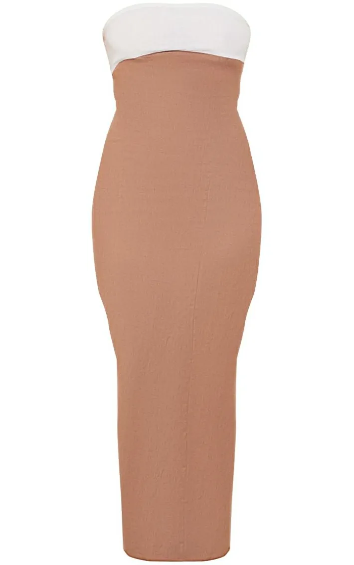 Enter the new season in style with this camel linen look two tone bandeau maxi dress. Made from a camel hue linen look material that we just can’t get enough of right now and featuring a two tone design, what more could you want? With a bandeau neckline and a flattering maxi style, you really can’t go wrong. Just add sandals, a matching hue mini bag and oversized sunglasses to complete the look.