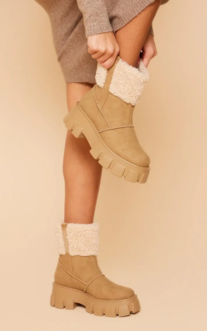 Step into the new season in style with these camel wide fit faux suede shearling chunky platform ankle boots. Brought to you in a camel hue faux suede material with a wide fit design and chunky platform, what more could you want? Style these ankle boots with your outfit of the day for a cosy finishing touch to any look.