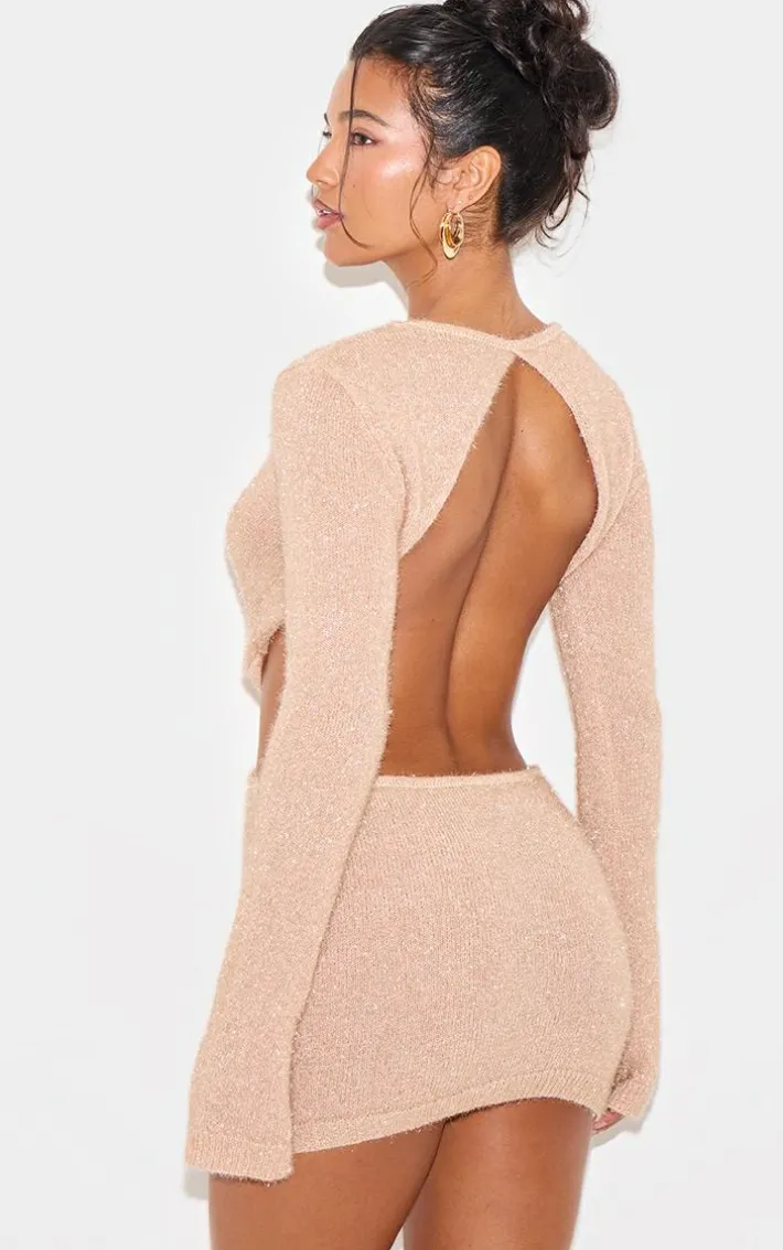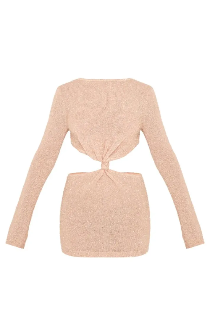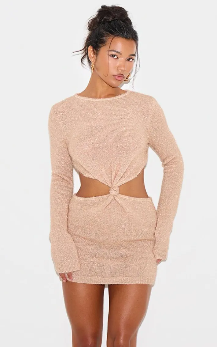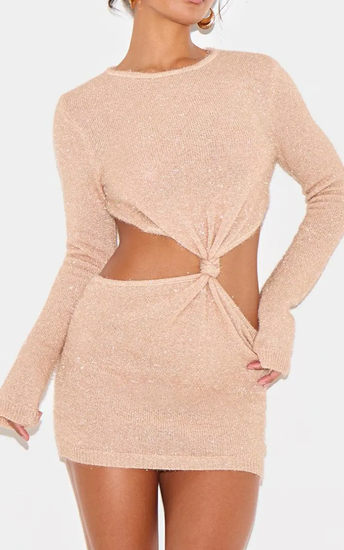 This champagne tinsel knit twist front open back mini dress is an unbelievably chic party piece. We’re obsessed with its elegant champagne hue fabric, tinsel knit design and twist front feature, perfect for your next evening or weekend out. Add a pair of statement gold earrings, sparkly silver heels and any must-have accessories for an elevated look.