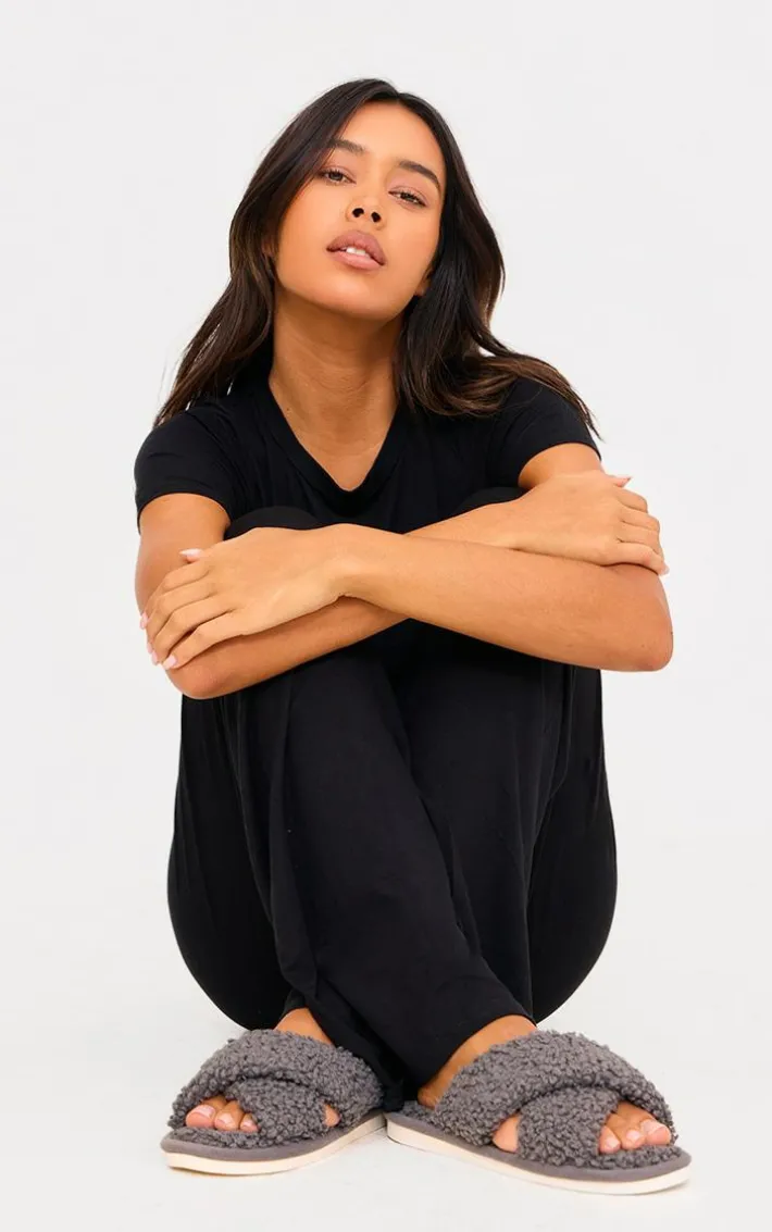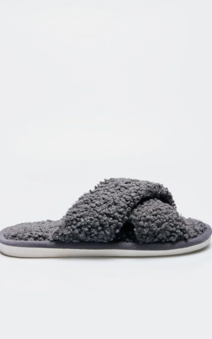 These charcoal borg cross over slippers are a perfect addition to your cosy collection. Brought to you in a staple charcoal shade, with a luxe borg material and cross over design, they are a versatile option for a night in. Simple style with a lounge set to finish the look.