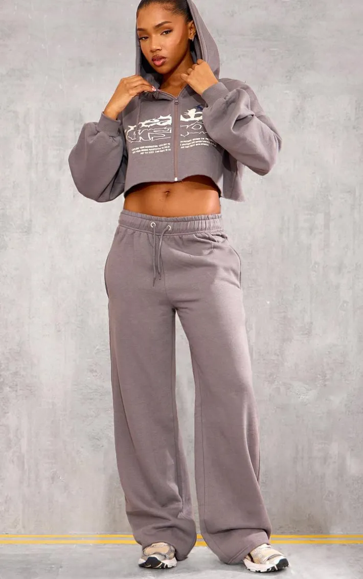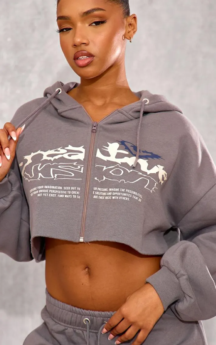 Your off-duty days are calling out for this charcoal Graphic oversized cropped zip hoodie. Brought to you in a charcoal material with a Graphic design and an oversized fit, what more could you want? This cropped hoodie has a zip fastening that is sure to feel edgy. Team with your fave accessories and the matching sweatpants to finish off the look we are loving.