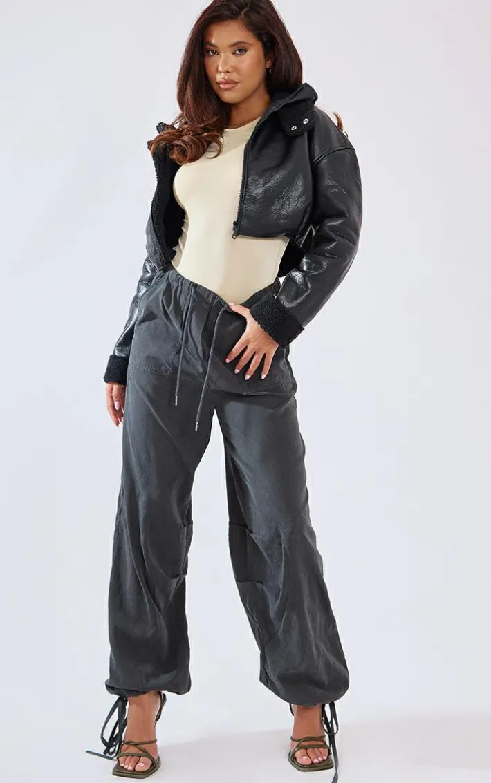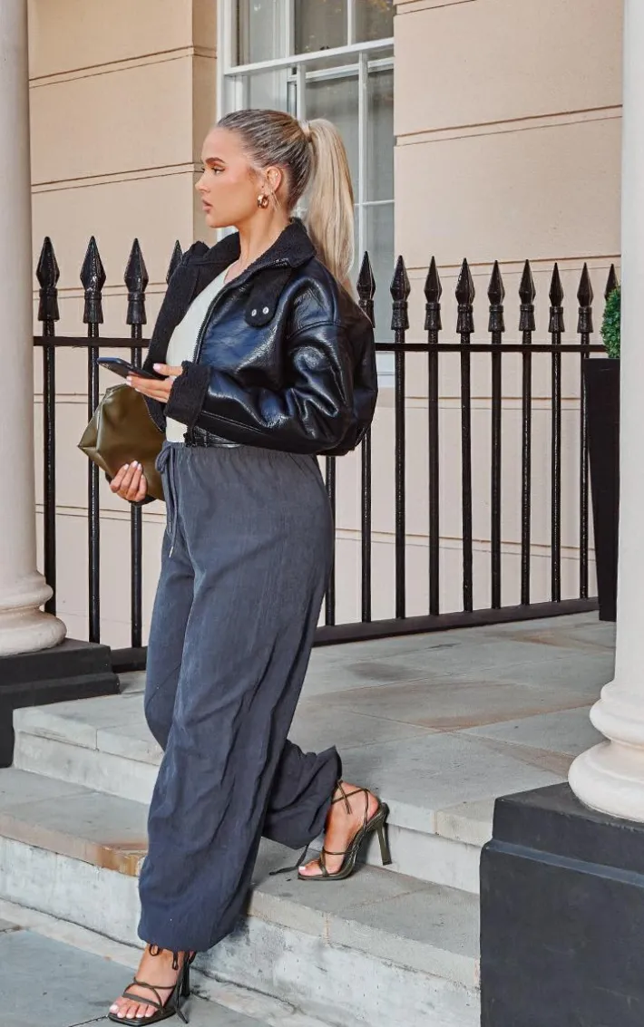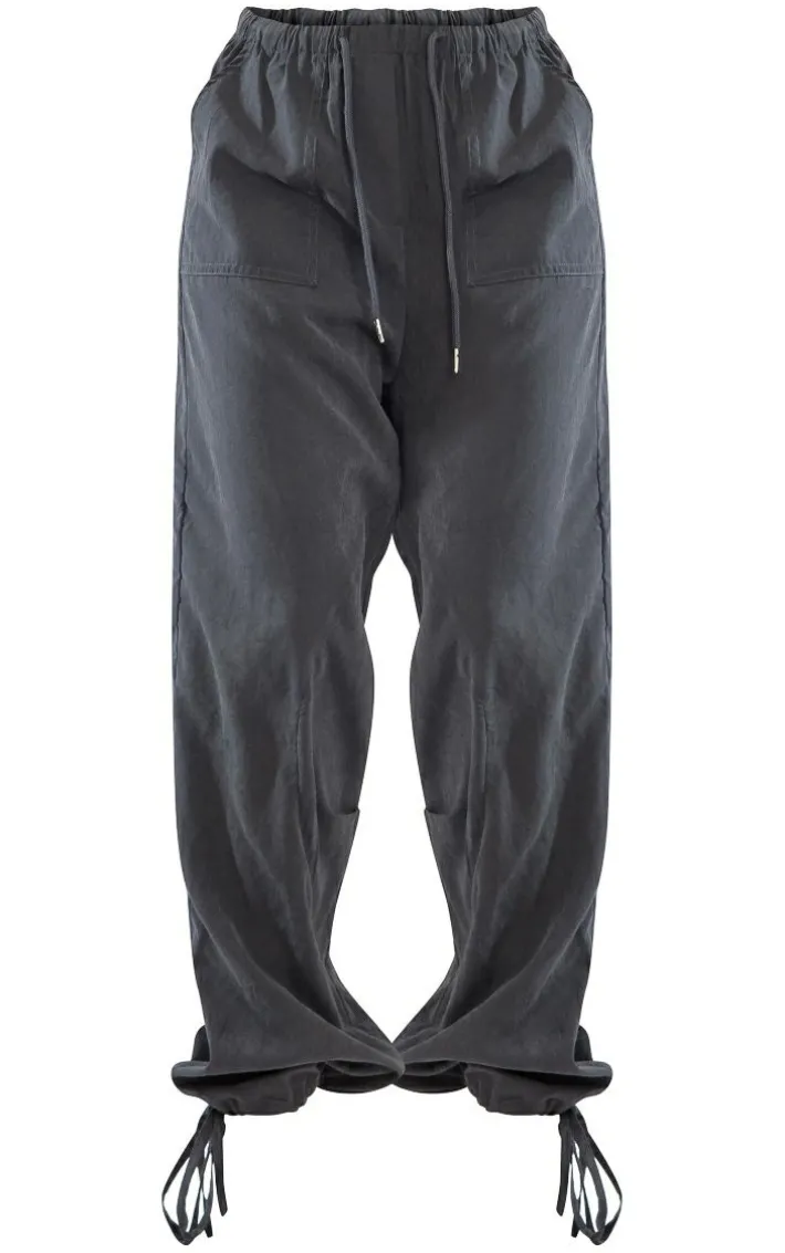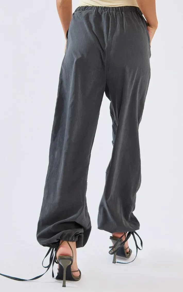 Nail new season trends with these cargo bottoms. Featuring a charcoal grey peach skin material with a tie cuff design and a flattering fit, we are in love. Pair with a sweatshirt and fresh kicks to level up the look.