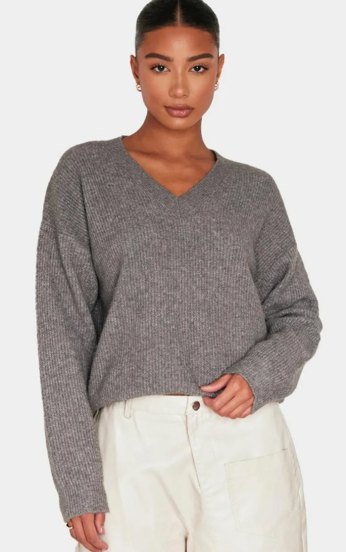 Don’t sacrifice style for warmth with this charcoal soft knit V neck oversized sweater. Brought to you in a charcoal hue soft knit material with a V neckline and oversized fit, this sweater is all the new you need. Style with white oversized shorts, knee high boots and a faux suede bag for an on-trend A/W look we can’t take our eyes off.