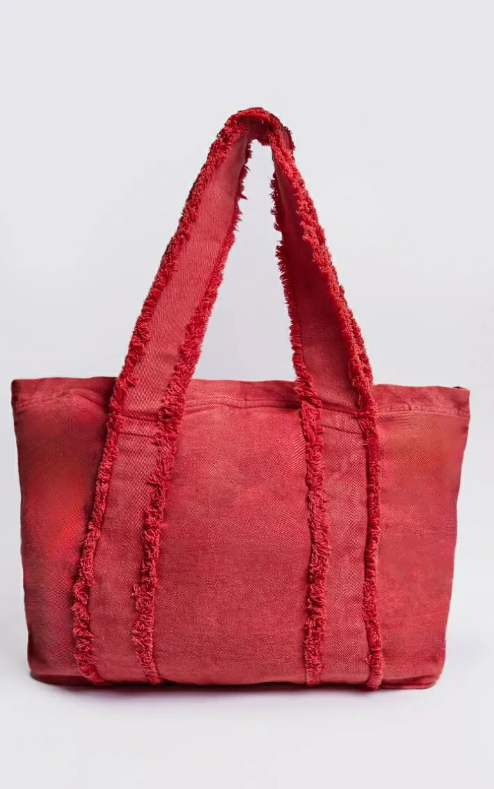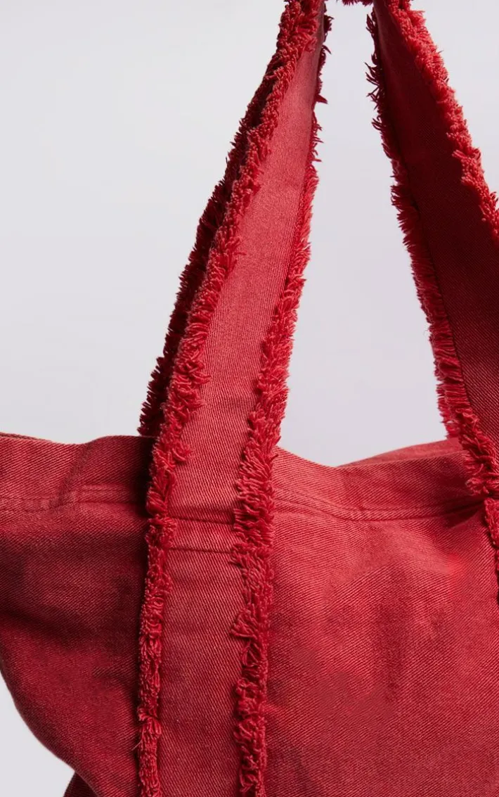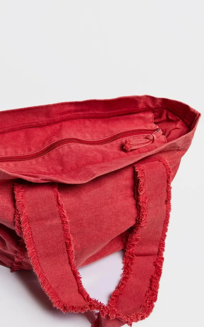 Brighten up your accessory collection with this cherry red denim frayed zip tote bag. Brought to you in a cherry red denim material with a frayed design, a zip fastening and a relaxed style, we are in love. Simply add this cherry red tote bag to your outfit of the day for a statement finishing touch.