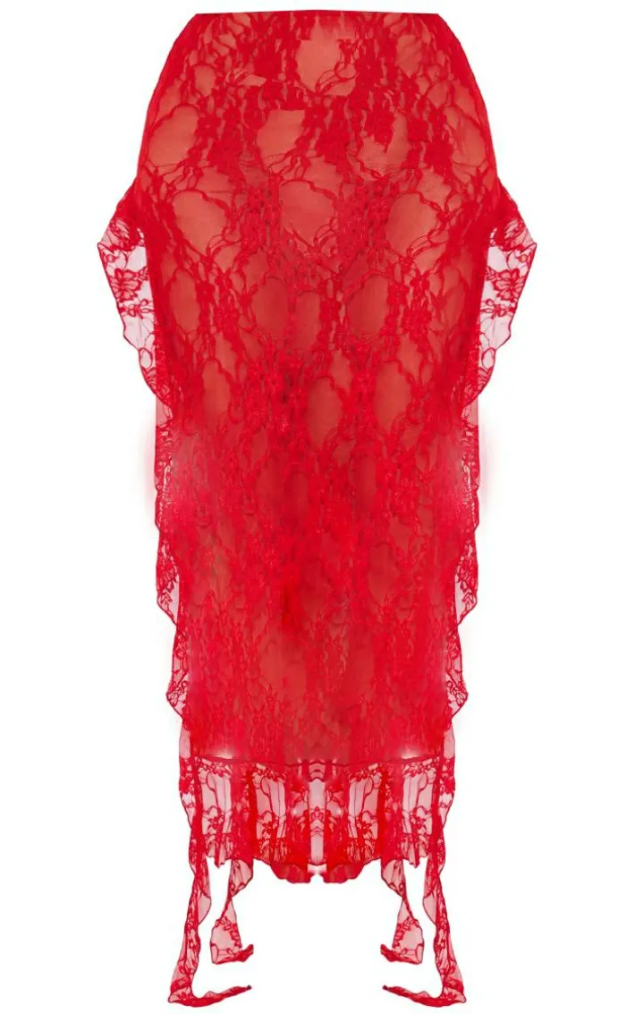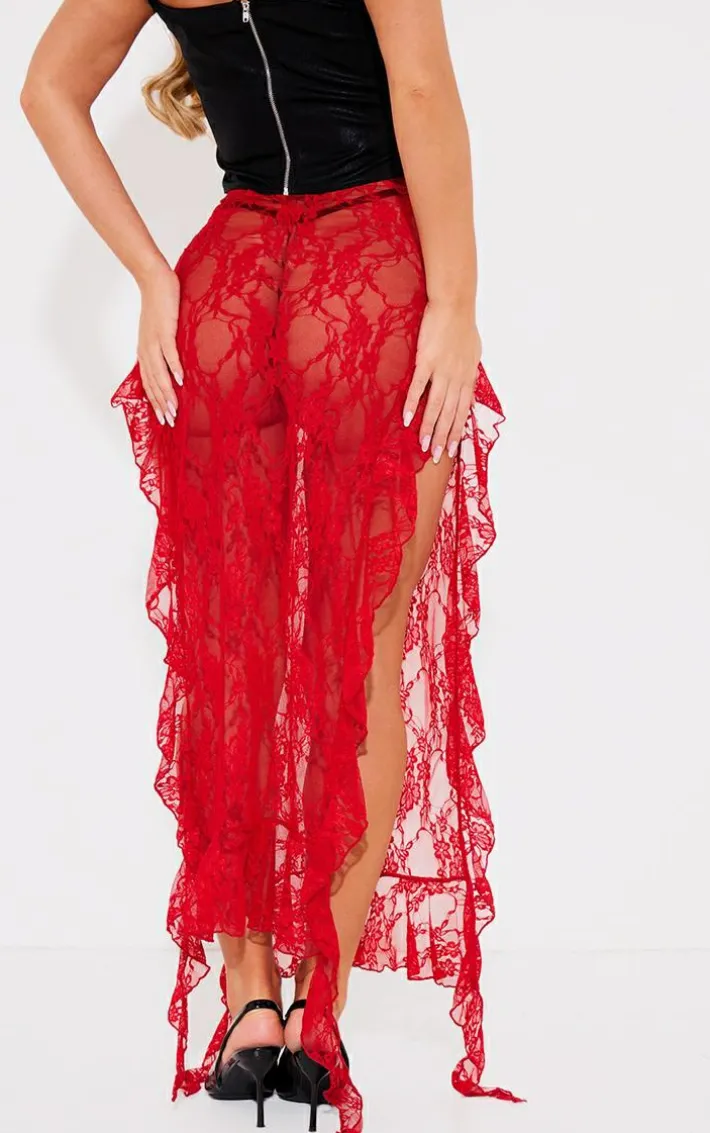 Add some statement hues into your look with this red lace side split ruffle detail maxi skirt. This maxi skirt is brought to you in a cherry red material with a lace-side and ruffle detail, what’s not to love? This maxi skirt is here to banish any of your what-to-wear dilemmas. Just add the matching top, high heels and accessories for a look that won’t let you down.