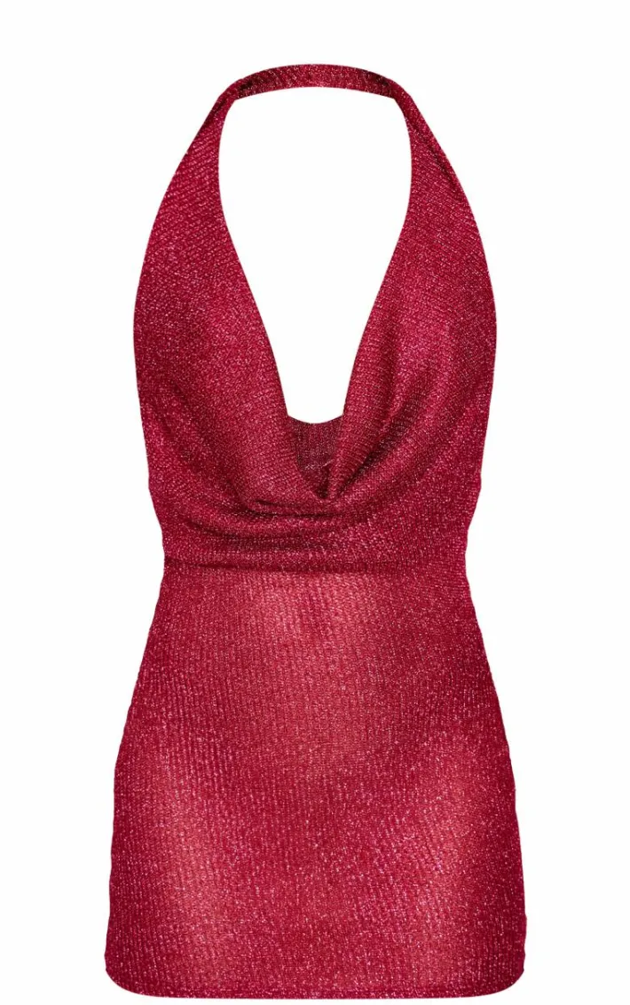 Make a statement in this cherry red metallic ribbed cowl neck mini dress. Brought to you in a cherry red metallic ribbed material with a cowl neck design and a flattering mini fit, how can you not be obsessed? Style this mini dress with court heels and accessories for a look they won’t be able to take their eyes off.