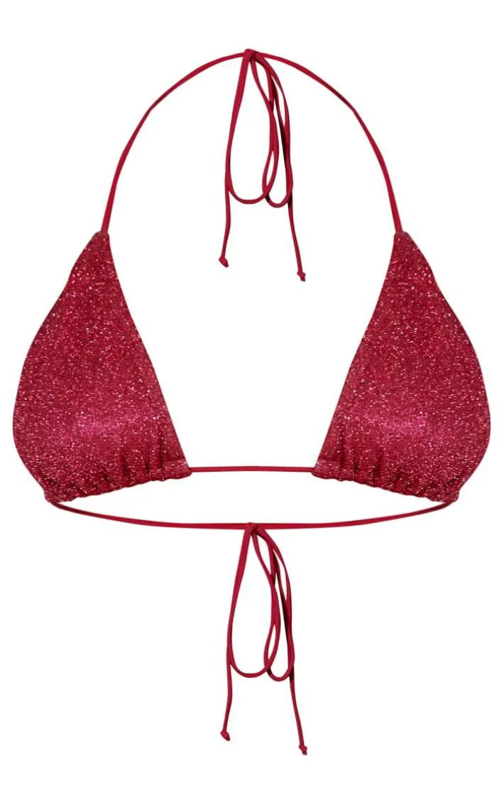 Show off your glow on your upcoming vacay with this cherry red triangle glitter bikini top. Made from a cherry red glitter material with a tie-fastening and triangle design, what’s not to love? This bikini top is sure to gain you all the attention as you relax poolside we know you won’t be able to resist. Team with the matching bikini bottoms, gold accessories and slides for a look that everyone will want.