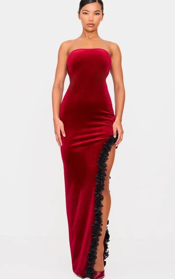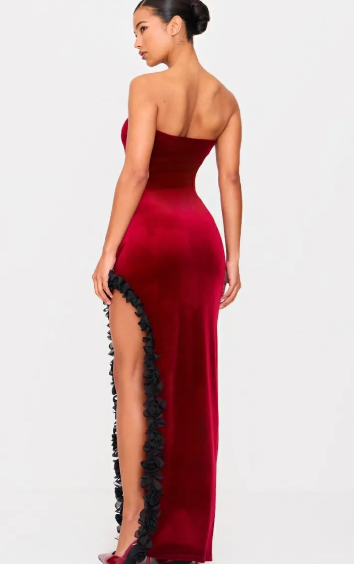 Don’t blend in this season, and opt for this cherry red velvet bandeau rose detail slit midaxi dress. Brought to you in a cherry red velvet material with a bandeau design and a rose detail, you are sure to feel chic this season. With a slit side, this midaxi dress is the ultimate must have. Pair with heels and your go-to accessories to finish off the look.