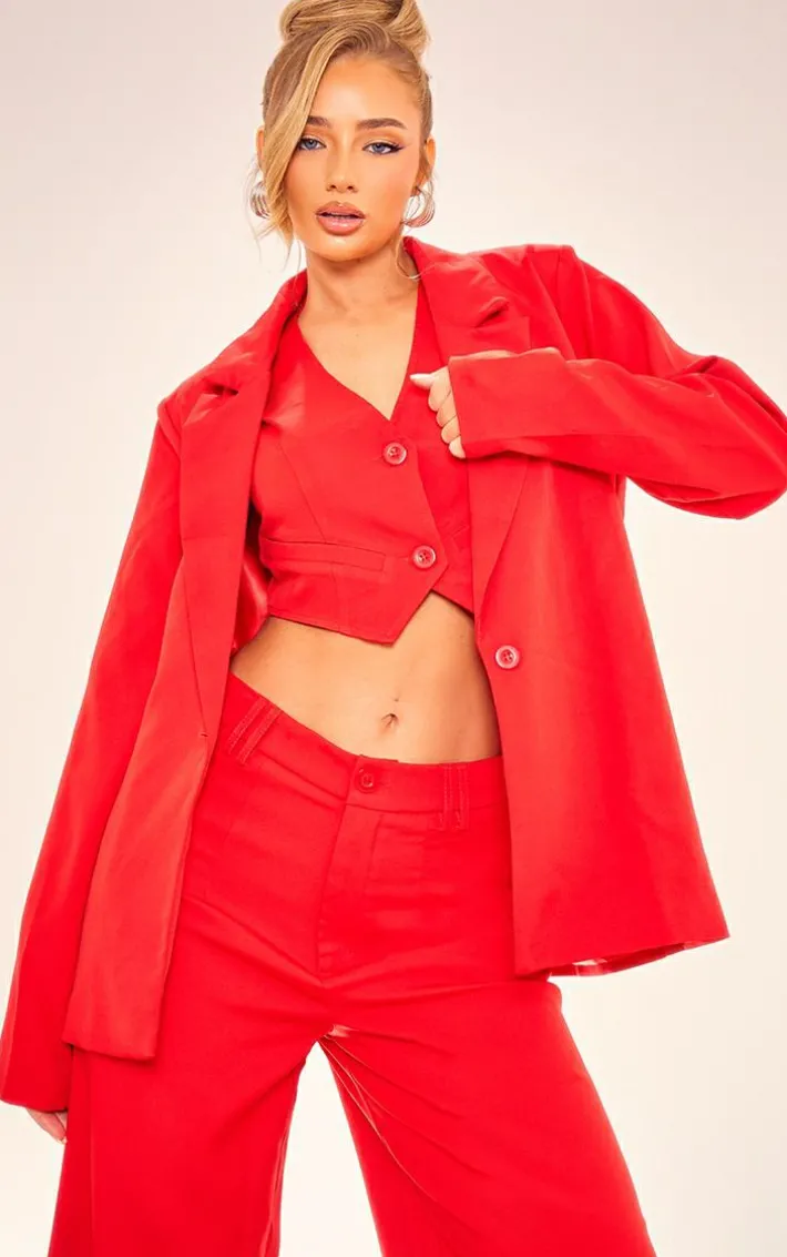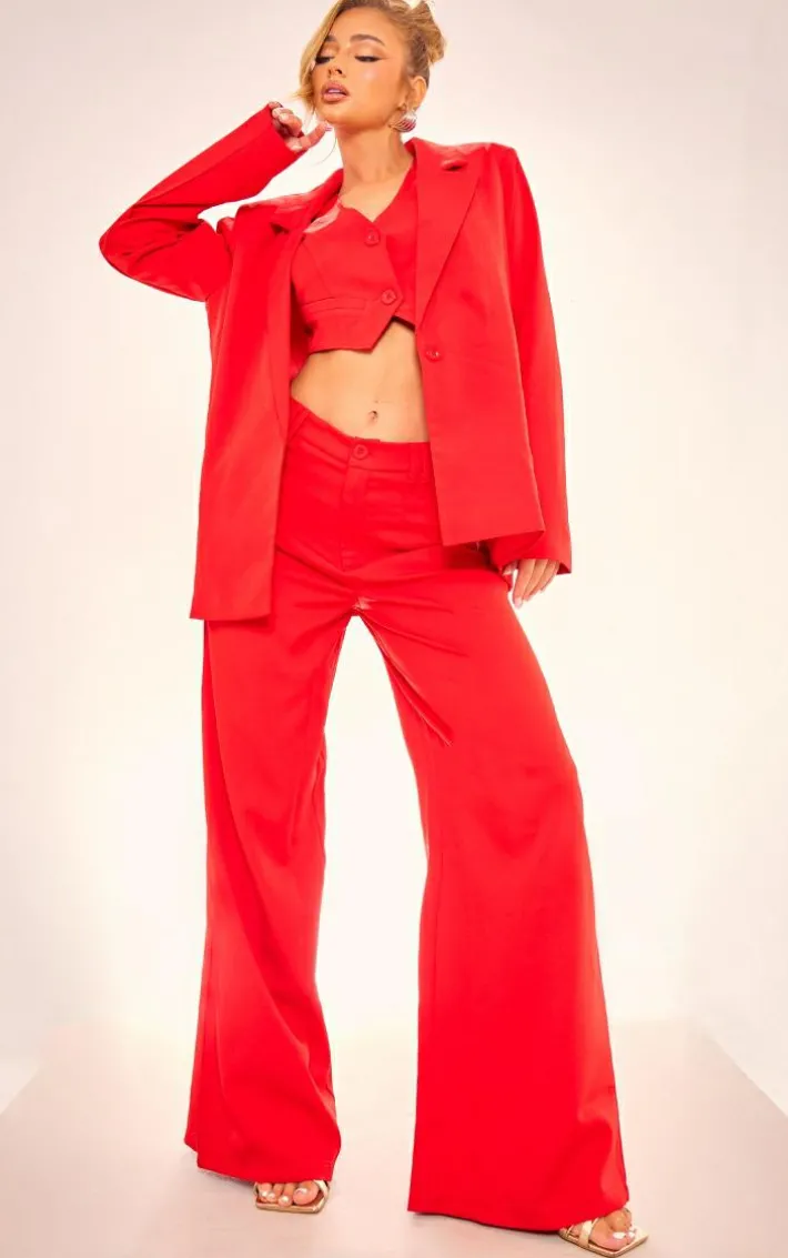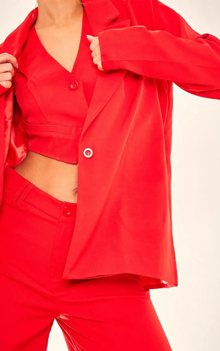 Nail major trends this season with this cherry red woven oversized suit jacket. Brought to you in a cherry red woven material with an oversized design, what’s not to love? This suit jacket is all you need to step out in style this season and beyond. Team with the matching bottoms and vest for a fool proof finish.