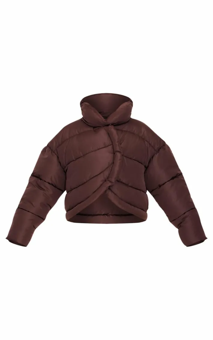 When the cold weather calls, so does this chocolate brown quilted asymmetric high neck puffer jacket. Brought to you in a chocolate brown hue quilted material with an asymmetric design and high neck detail, this puffer jacket is all the new you need. Style seamlessly with wide leg bottoms, fresh kicks and simple accessories for a chic finish.