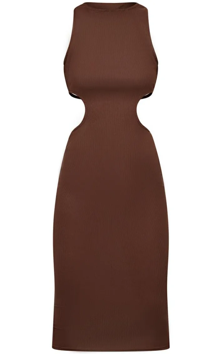 Take your new season wardrobe to the next level with this dress. Featuring a chocolate brown ribbed material with a cut out side design and a midaxi length. Team with strappy heels and simple accessories to earn some serious style points.
