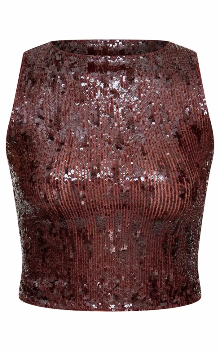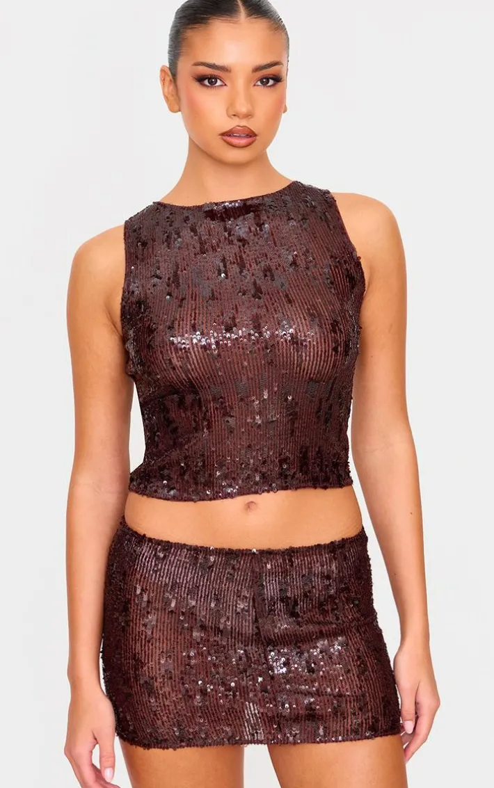 Opt for this chocolate brown sequin long top for a look that you’ll be reaching for over and over. Brought to you in a seasonal chocolate brown hue, with a luxe sequin material and long design, this top is sure to be your next weekend go-top. Team with the matching mini skirt and a pair of heels for a look that won’t go unnoticed.
