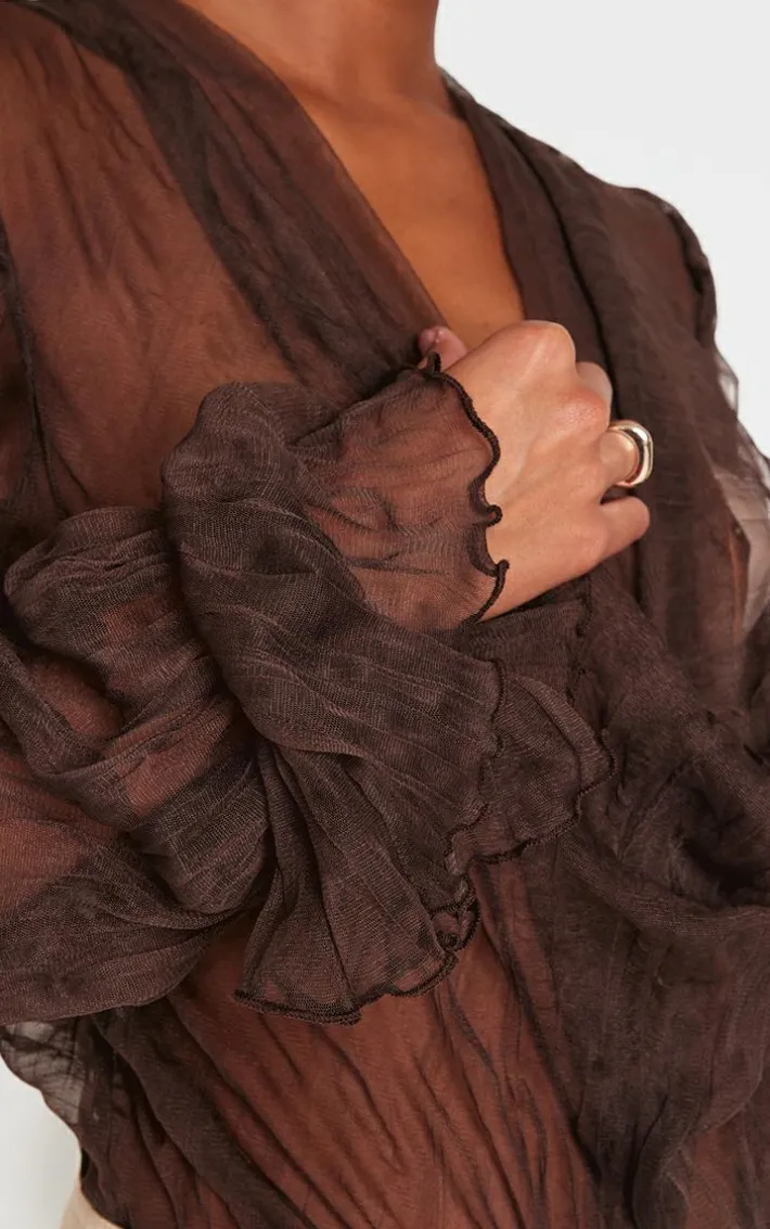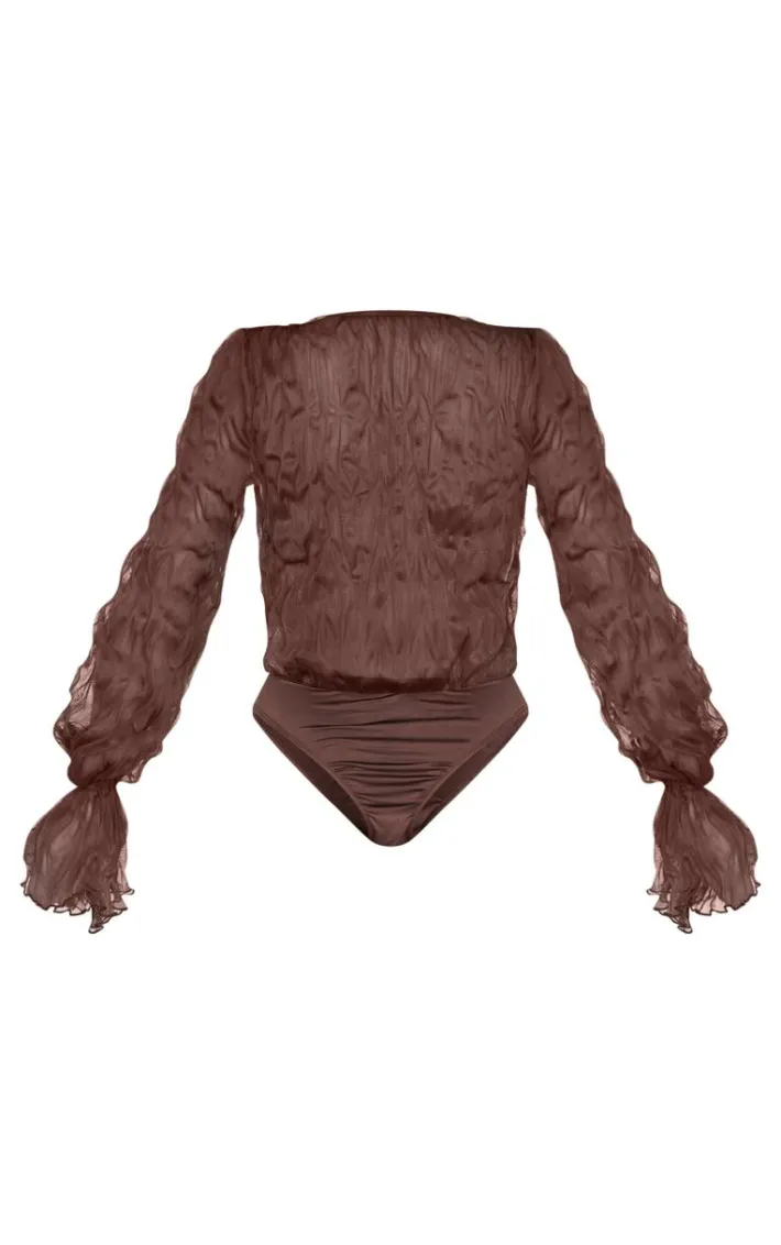 Introduce some new season hues into your wardrobe with this chocolate crushed mesh sheer cowl bodysuit. With its chocolate crushed mesh fabric and cowl neckline, this bodysuit is perfect for elevating any evening look. We’re all about pairing it with contrasting hue mini shorts, a faux leather handbag and court heels.