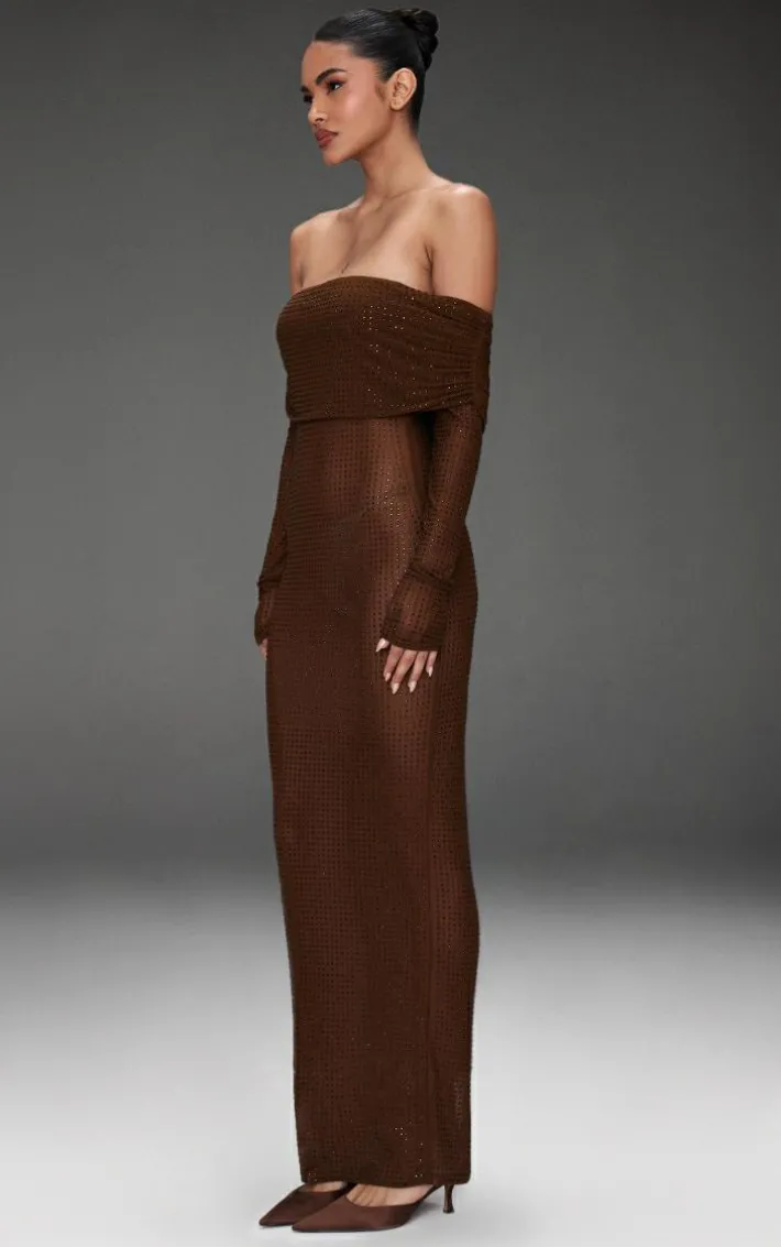 Have all heads turning in your direction on your next night out with this chocolate diamante mesh bardot maxi dress. With its elegant maxi dress length, chocolate diamante mesh fabric and bardot neckline, you’ll be feeling so confident in this. Style with chic heels and your favorite jewelry for an unmissable finish.