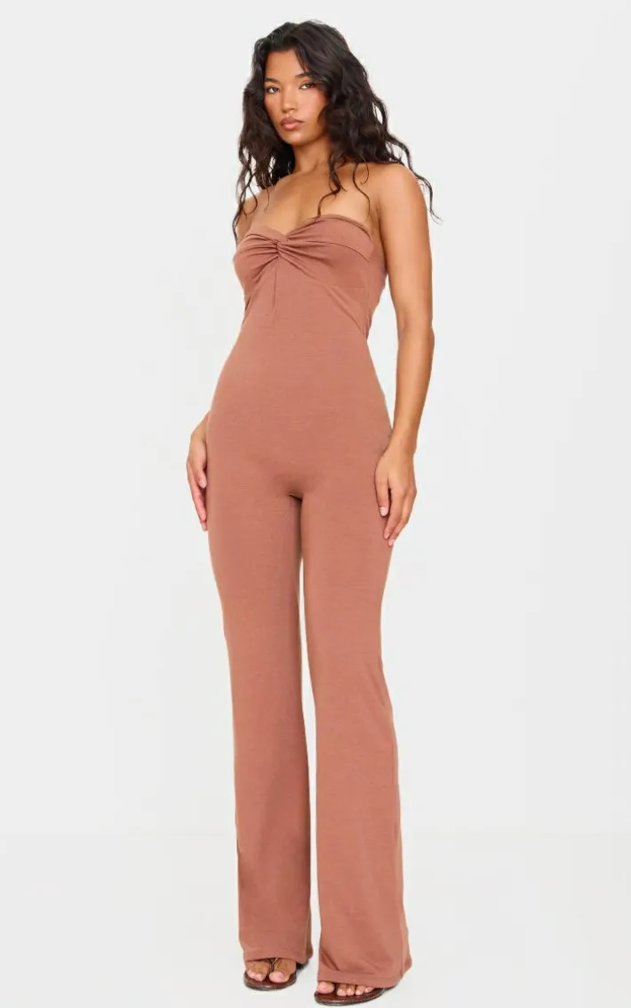 Turn heads for all the right reasons in this chocolate double layer contour jersey twist bandeau jumpsuit. Brought to you in a chocolate double layer contour jersey material with a twist detail and bandeau neckline, this jumpsuit is calling your name. Style with nude heels and gold accessories for a figure-flattering finish. It’s a yes from us.