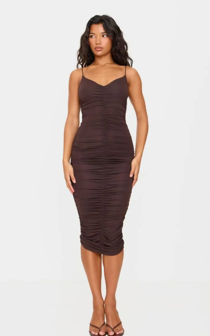 Keep your weekend look simple with this dress. Featuring a chocolate material with an extreme ruched design, spaghetti straps and a midi length, how could you say no? Style with clear high heels and white shoulder bag for a chic finish.