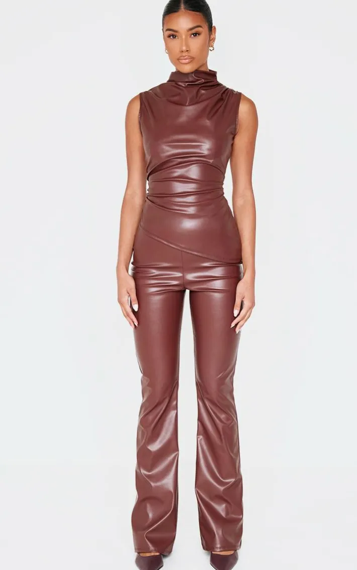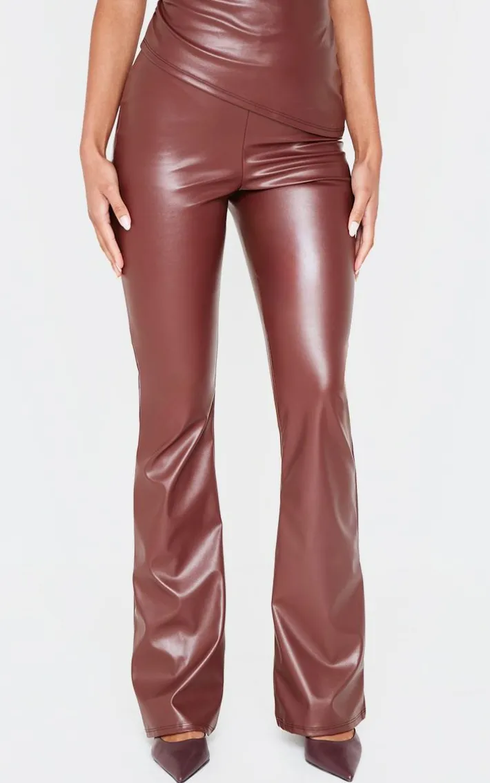 Switch up your weekend style game with these chocolate faux leather high waisted flares. Made from a chocolate faux leather material with a high waisted design and a flattering flared leg fit, how can you resist? Style these faux leather flares with the matching top and heels for a look that will make heads turn.
