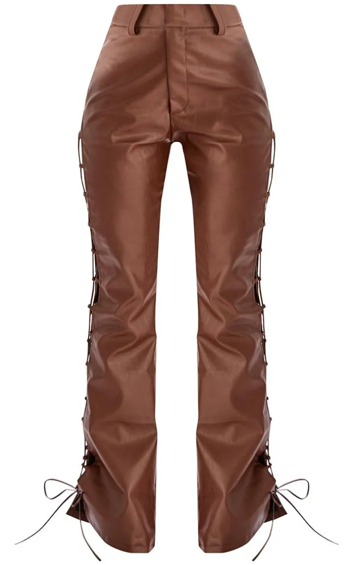 Add a little edge to your outfit of the day with these chocolate faux leather lace up side flared pants. Made from a chocolate hue faux leather material with a lace up side design and a flattering flared fit, how can you resist? Just add a crop top, clear strap heels and a mini bag for a look we can’t get enough of.