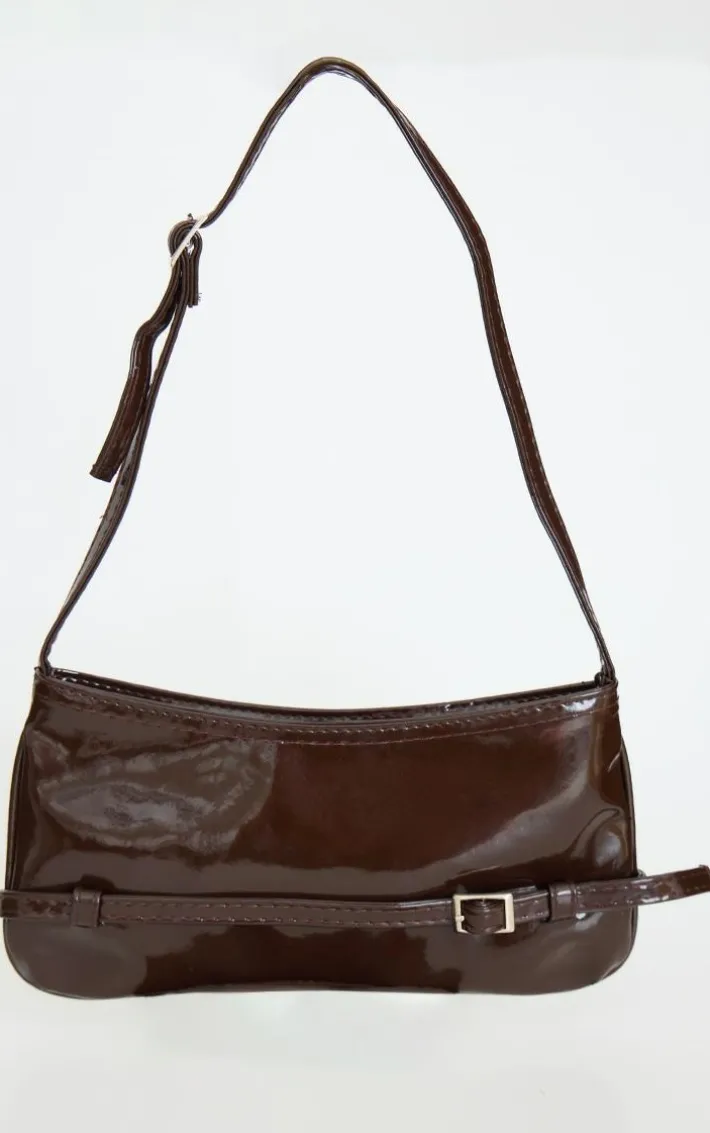 Elevate your style with this chocolate patent PU buckle baguette shoulder bag. Brought to you in a chocolate hue patent PU material with a buckle detail and baguette design, this shoulder bag is all the new you need. How can you resist? Add to your outfit of the day for a chic finish.