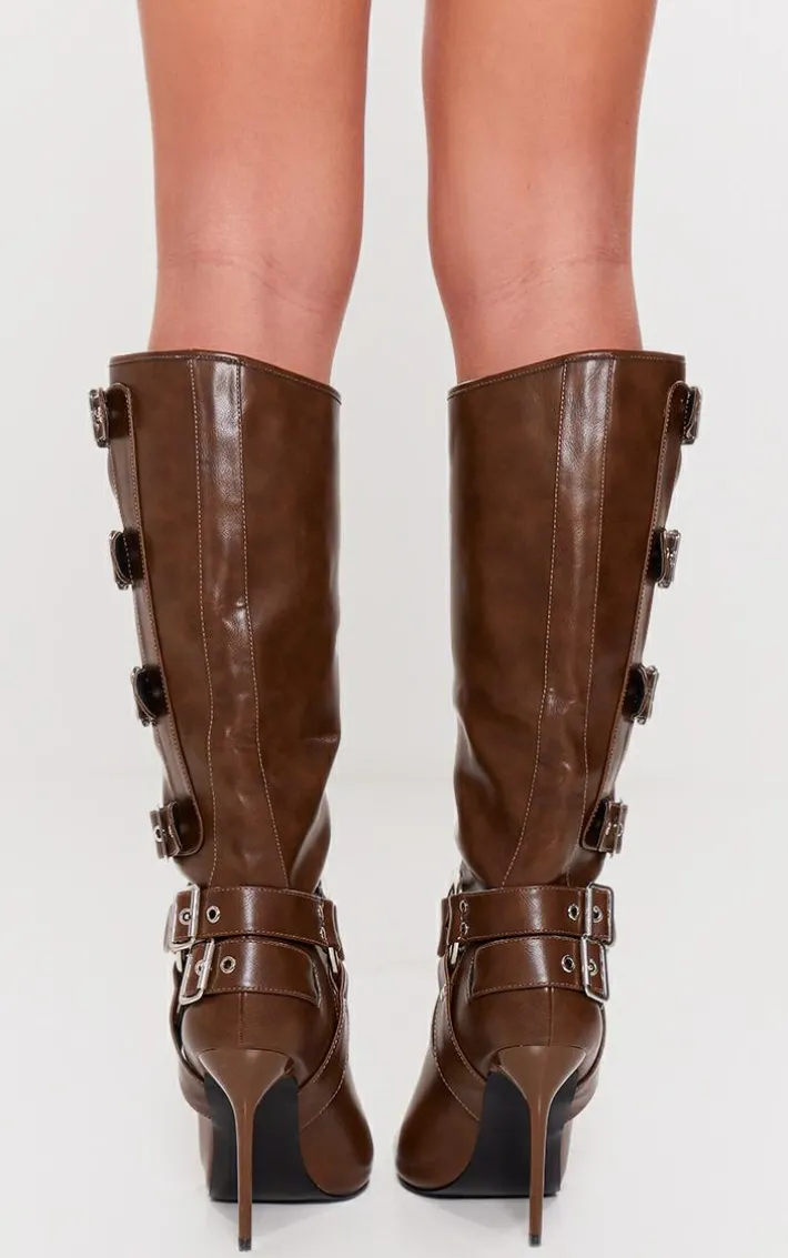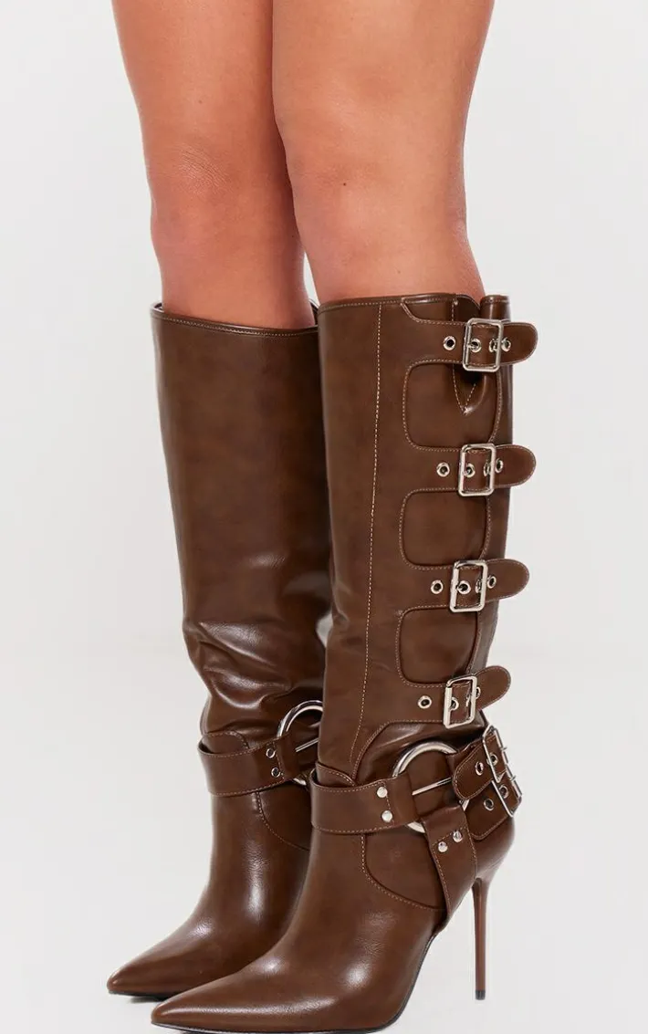 Step into the new season in style with this chocolate PU point toe buckle detail knee high heeled boots. Brought to you in a chocolate PU material with a point toe design, buckle detailing and a knee high style, we just can’t get enough. Just add these heeled boots to your weekend wardrobe pieces for a look that will really make a statement.