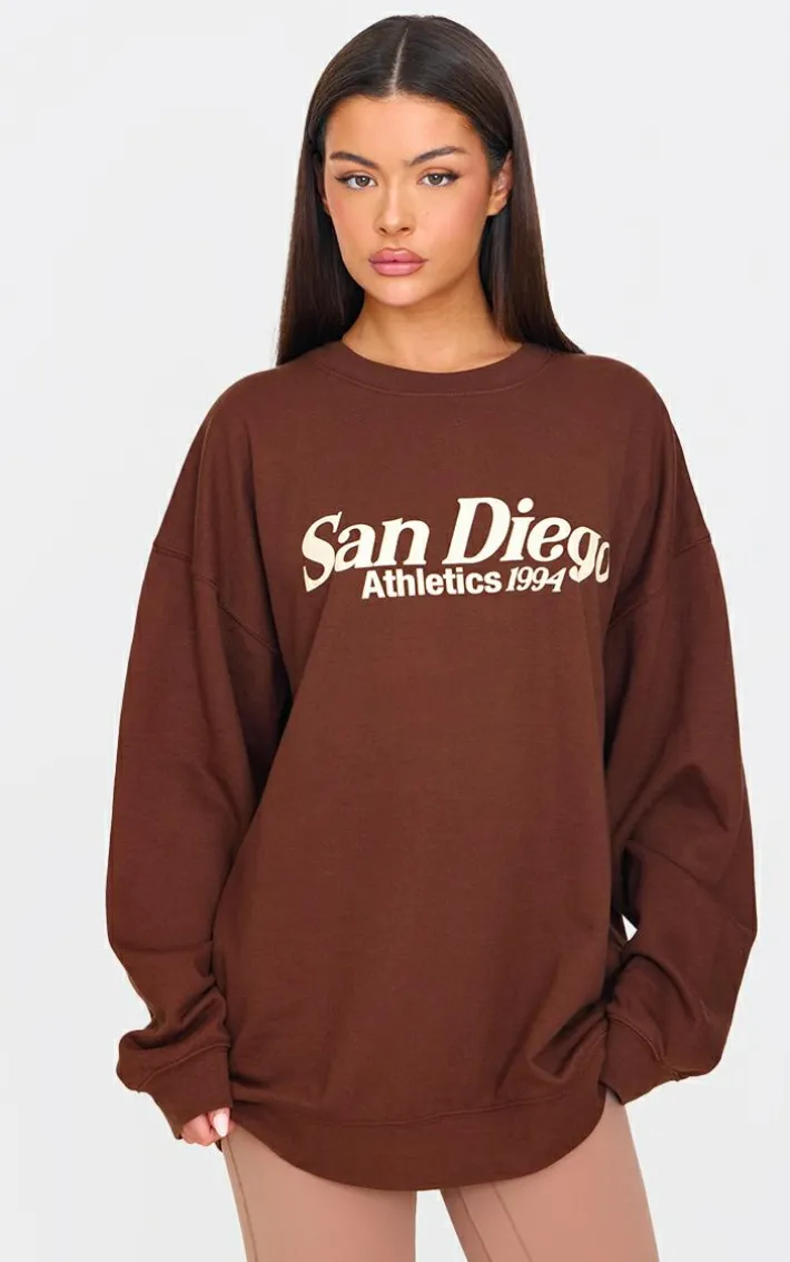 Your ‘what to wear dilemmas’ have been solved with this chocolate San Diego athletics printed sweatshirt. Brought to you in a chocolate hue sweat material with a ‘San Diego Athletics’ printed design, this sweatshirt is all the new you need. Team with leggings, fresh kicks and simple accessories for a look like no other.