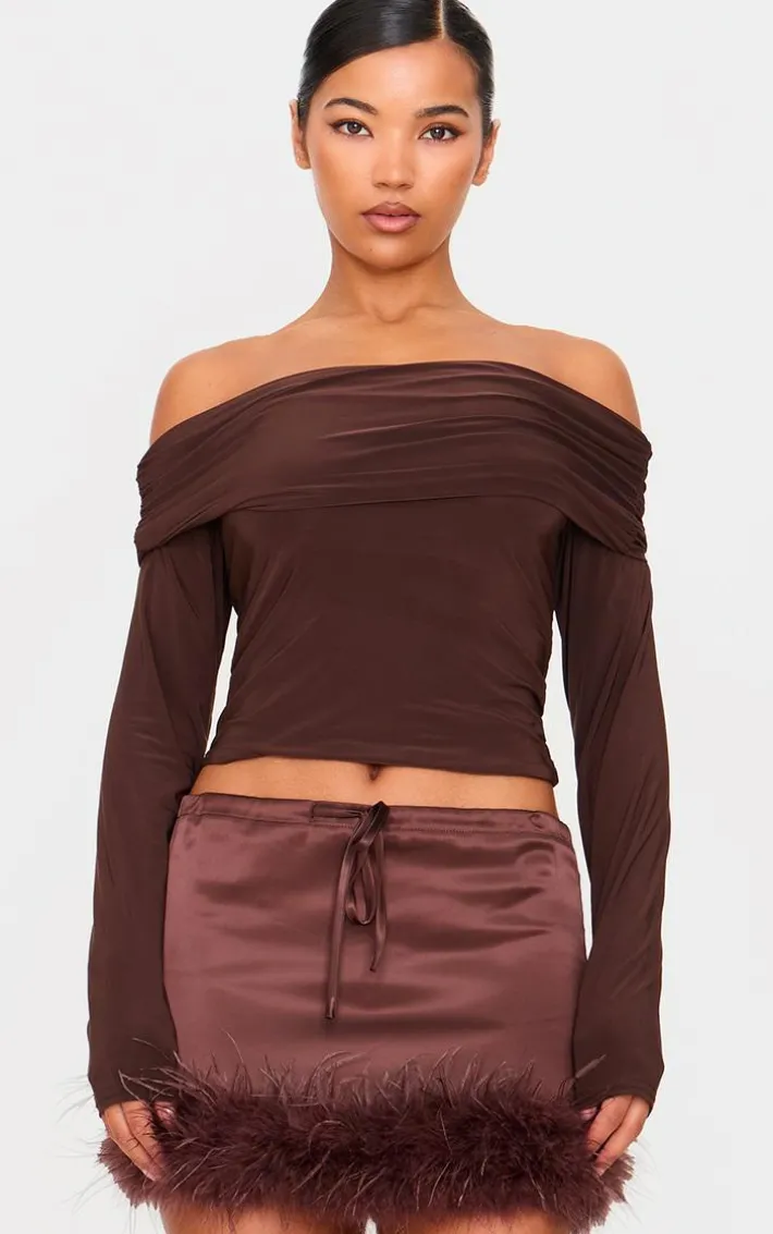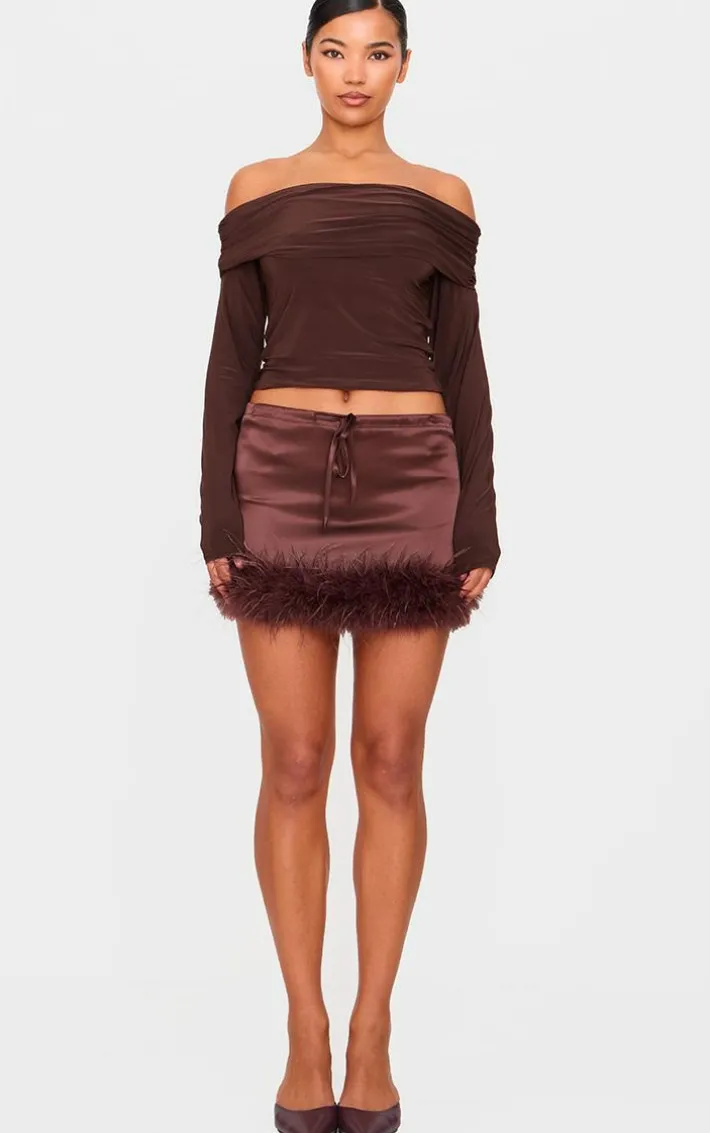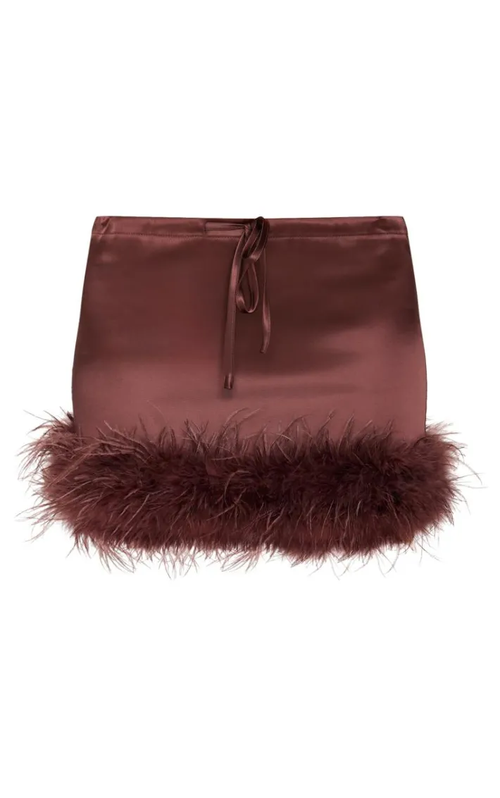 Elevate your new season wardrobe with this chocolate satin drawstring waist detail feather hem mini skirt. Brought to you in a chocolate hue satin material with a drawstring waist detail and feather hem design, this mini skirt is all the new you need. Team with a chocolate hue off the shoulder top, slip on heels and go to accessories for a chic finish we’re loving.