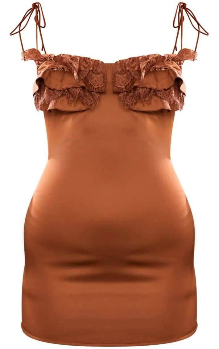Your weekend wardrobe dilemmas have been solved with this chocolate satin lace cup detail tie shoulder mini dress. Brought to you in a chocolate hue satin material with a lace cup design, tie shoulder detailing and a flattering mini fit, how can you resist? Style this mini dress with clear strap heels and gold accessories for an effortlessly chic look that will steal all the stares.