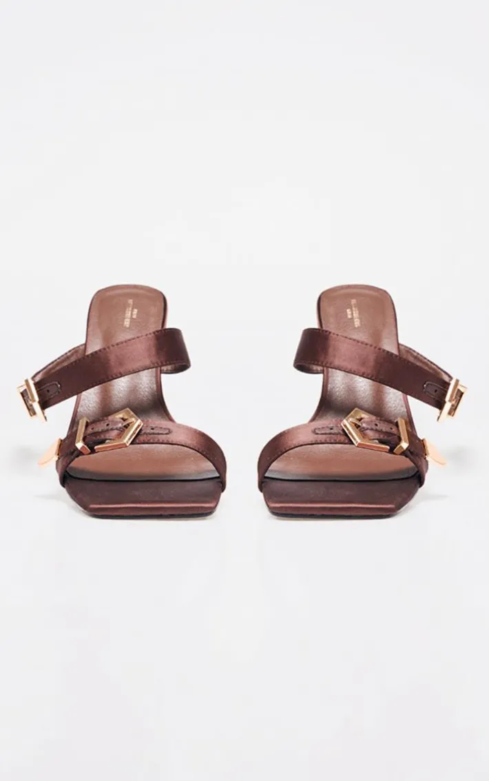 Step into the new season in style with these chocolate satin wide fit square toe buckle strap high stiletto heeled mules. Brought to you in a brown satin material with a square toe design, a wide fit and buckle strap detailing, how can you resist? Just add these heeled mules to your weekend outfit to complete the look.