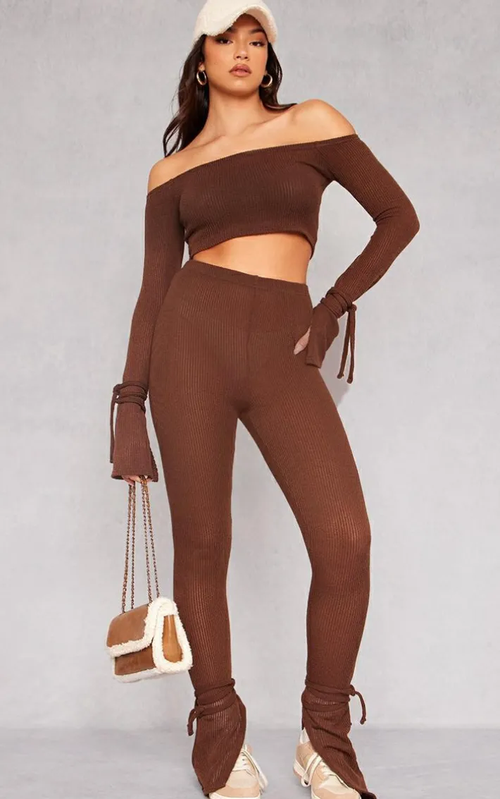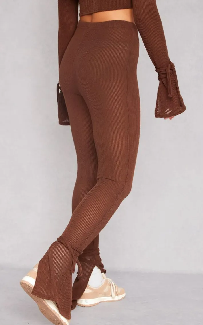 Upgrade your off-duty wardrobe with these chocolate sheer soft rib split hem tie detail leggings and be sure to earn all the compliments. Brought to you in a chocolate sheer soft rib material with a split hem and tie detail, how could you say no? Simply add the matching top, a baseball cap and box-fresh sneakers for a fool-proof finish which is bound to make everyone stop and stare.