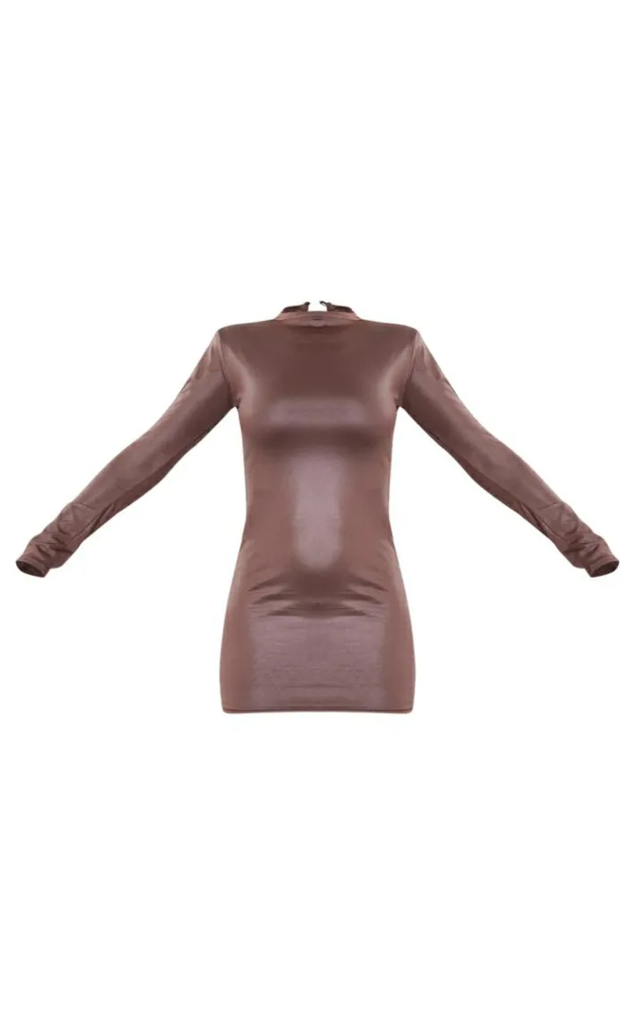 Show off your unreal figure this weekend in this chocolate shiny long sleeve high neck mini dress and be prepared to steal all the stares. With a chocolate shiny material, a high neckline and long sleeves, how could you not be in love? Whatever your plans are this weekend you are sure to turn heads for all the right reasons with this mini dress. Team with your highest heels, gold accessories and a mini bag for a flawless finish.Â