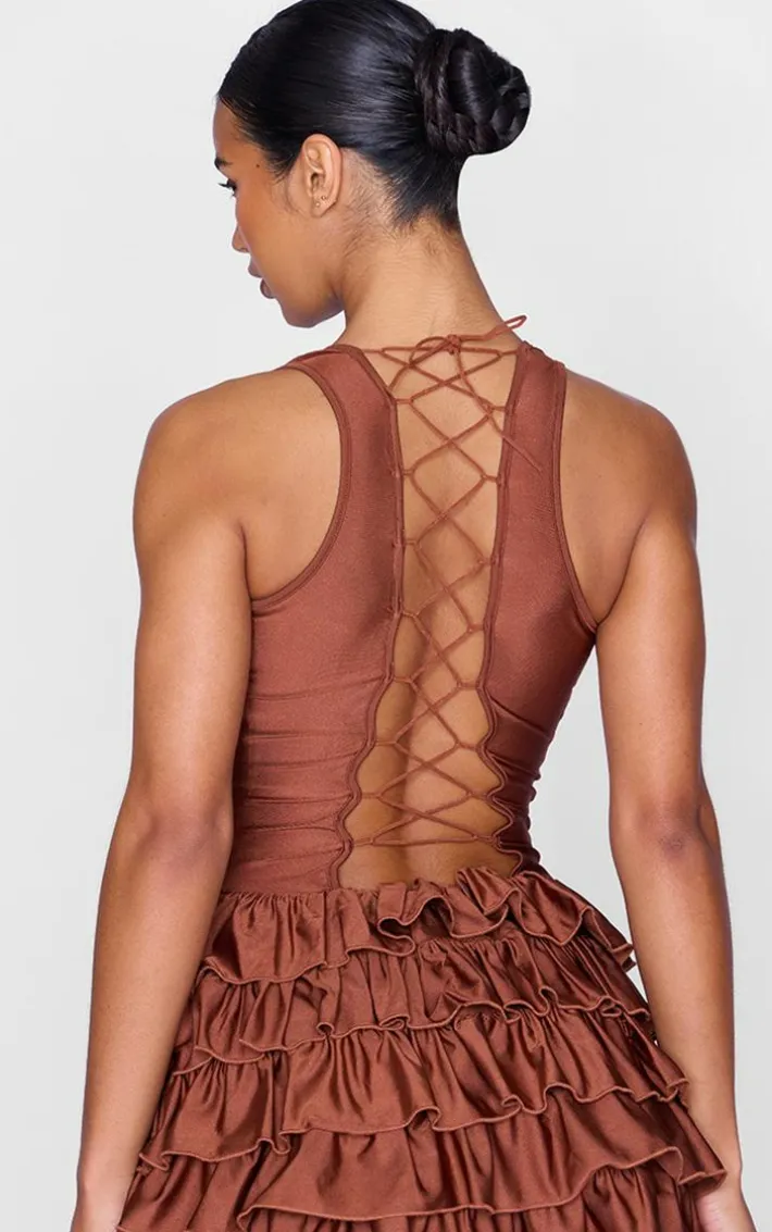 Be the best dressed with this chocolate slinky frill hem micro mini dress. Brought to you in a chocolate slinky material with a frill hem detail and a micro mini length, you are sure to turn heads for all the right reasons in this mini dress. Team with a pair of court heels and your go-to accessories to finish off the look we are loving.