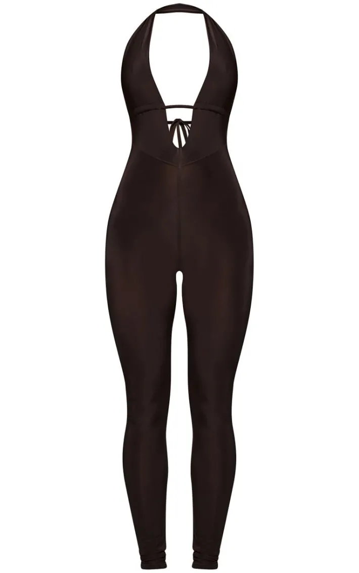 This chocolate slinky halter neck jumpsuit is an autumn/winter staple. Brought to you in a trending chocolate shade, with a slinky material for a figure- hugging finish and a halter neck design. Pair with some slip on heels and silver earrings for a look you won’t regret.